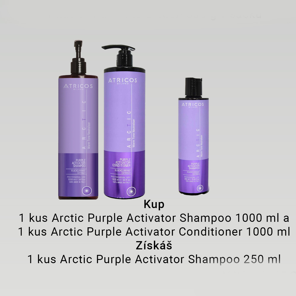 Pro využití této akce zakupte 1 kus Arctic Purple Shampoo 1000 ml a 1 kus Arctic Purple Conditioner 1000 ml a jako dárek získáte 1 kus Arctic Purple Shampoo 250 ml zdarma. Dárek přidáme do zásilky automaticky. Vyberte si zde -> https://www.hezke-vlasy.cz/hledani?query=arctic