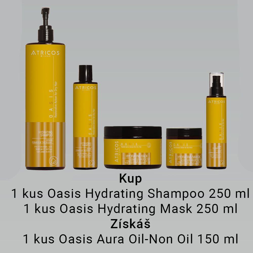 Pro využití této akce zakupte 1 kus Oasis Hydrating Shampoo 250 a 1 kus Oasis Hydrating Mask 250 ml a jako dárek získáte 1 kus Oasis Aura Oil-Non Oil 150 ml zdarma. Dárek přidáme do zásilky automaticky. Vyberte si zde -> https://www.hezke-vlasy.cz/hledani?query=oasis
