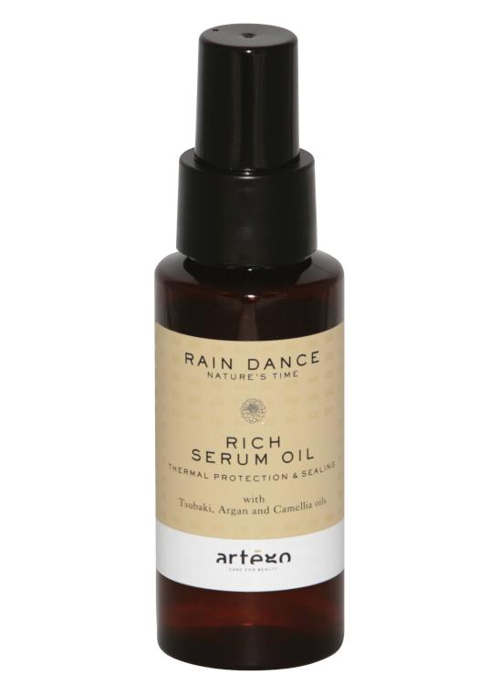 Bezoplachový zkrášlující olej Artégo Rain Dance Rich Serum Oil s regeneračními a ochrannými vlastnostmi. Dodává vlasům lesk a měkkost bez zbytečného zatížení. Ideální před a po sušení vlasů fénem. Složení obohacené o hydratující a změkčující oleje zanechává vlasy hebké a regenerované po dlouhou dobu. Tsubaki olej je čistý produkt, získávaný díky cenným květům kamélie, s neobyčejnými vyživujícími, zklidňujícími, změkčujícími a regeneračními účinky. Unaveným vlasům dodává znovu jejich lesk, měkkost a vitalitu. Arganový olej je bohatý na základní mastné kyseliny, vitamin E, Omega 3 a Omega 6, hluboko vyživuje vlasové kořínky. Působí proti stárnutí, hydratuje, vyživuje a chrání vlasy a vlasovou pokožku. Kaméliový olej je za studena lisovaný přírodní olej bohatý na vitamíny A, B a E. Brání stárnutí a dehydrataci vlasů a vlasové pokožky.