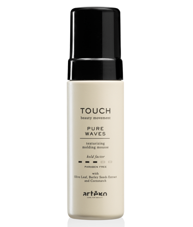 Artégo Touch Pure Waves je ekologická pěna pro objem vlasů bez plynu na bázi kukuřičného škrobu. Ideálně definuje přirozený tvar vlasů. Dodává vlasům objem a zvětšuje jejich pružnost. Kukuřičný škrob ideálně zvýrazňuje vlnitost vlasů, avšak ponechává vlasy lehké a měkké, nezatěžuje je. Obsahuje vůni japonské kamélie.
