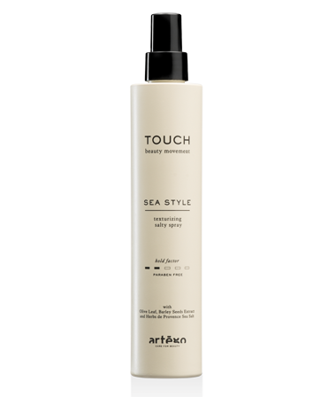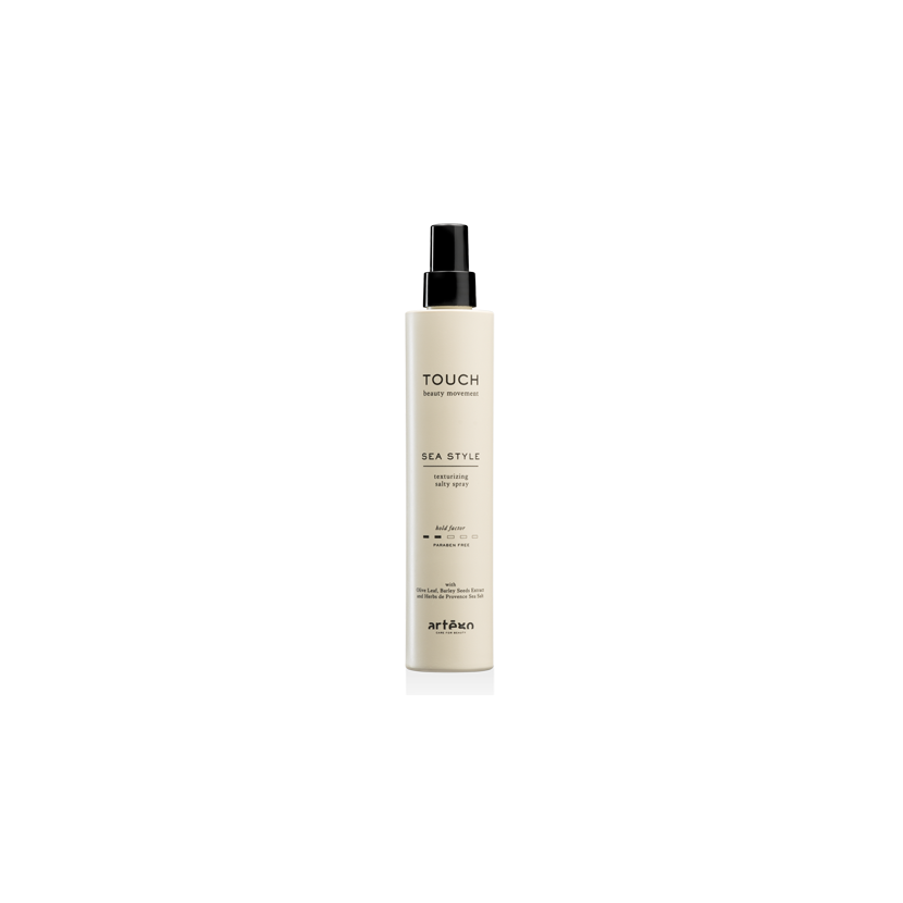 Artégo Touch Sea Style Spray je sprej s mořskou solí, jehož složení je založeno na krystalcích provensálské soli. Skvěle zdůrazňuje texturu vlasů. Obnovuje vlnitost a přirozený objem vlasů. Je vhodný pro muže i ženy. Krystalky francouzské provensálské soli jsou hlavní složkou, která je schopna maximálně zvýraznit texturu vlasů a zároveň vytvořit měkké vlny a přirozený objem, aniž by došlo k rozčepýření vlasů. Sprej je obohacen o vůni guajaku, fialky a palisandru.