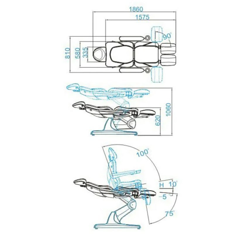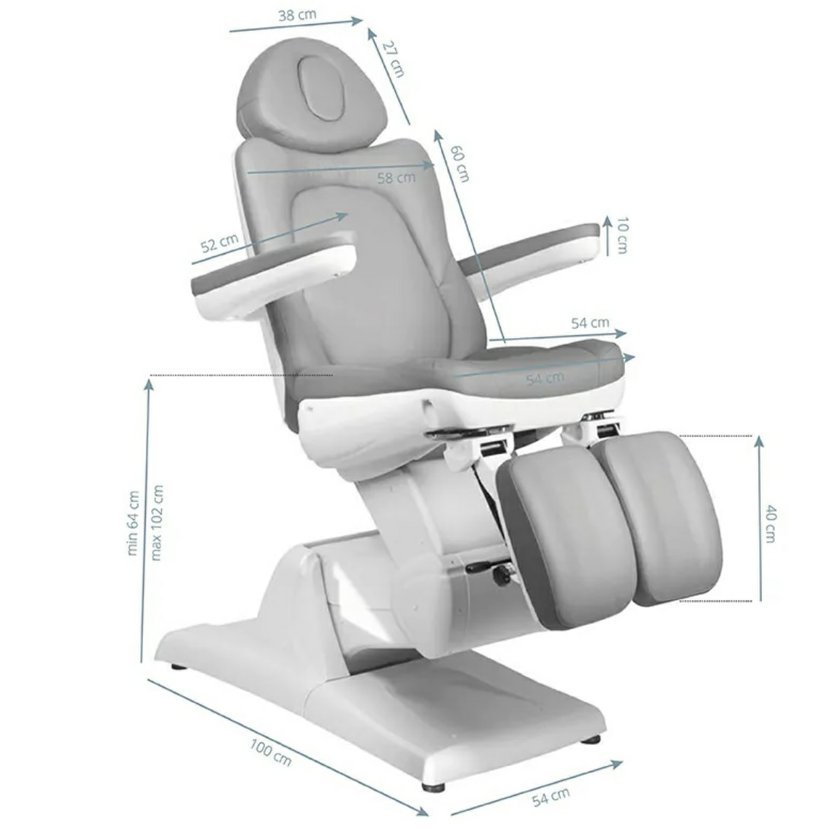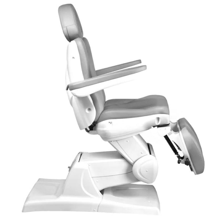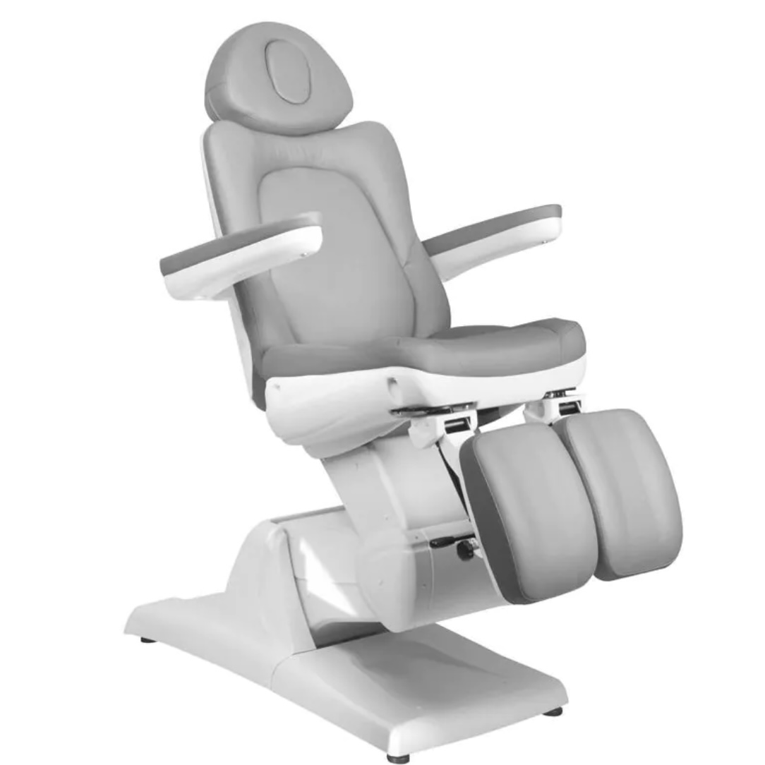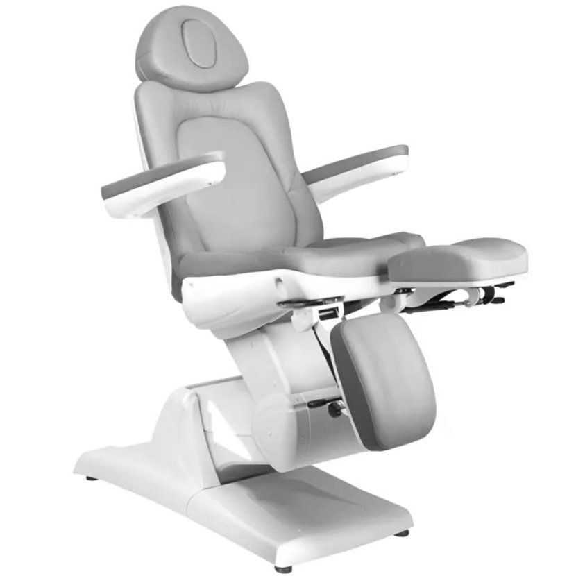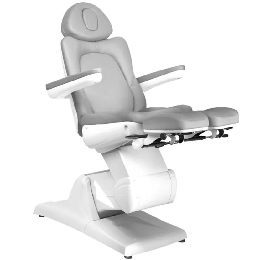 Azzurro 870S, kosmetické, pedikérské, elektrické, křeslo se 3 motory. Je elektricky nastavitelné. Tiché elektromotory umožňují rychlé a pohodlné nastavení sedadla. Křeslo má tvarovaný a velmi pohodlný sedák, je odolné a velmi stabilní. Díky zvýšeným područkám je pro zákazníka jednodušší sedět v křesle. Široká škála elektrického nastavení nahoru-dolů umožňuje individuálně přizpůsobit výšku křesla výšce osoby provádějící ošetření a typu procedury. Čalounění z vysoce kvalitní ekokůže. Křeslo je dostupné v šedé barvě.