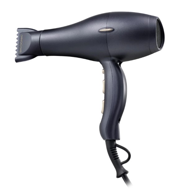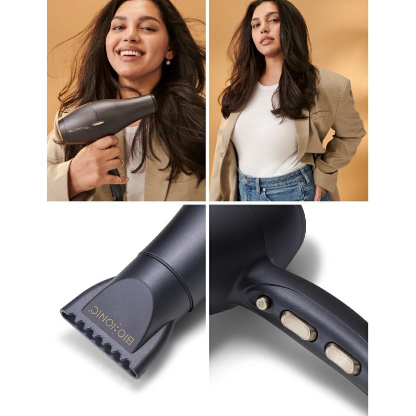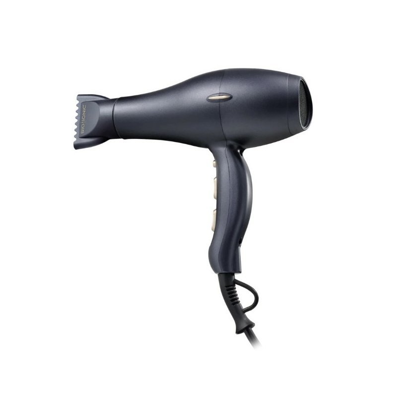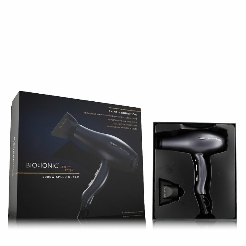 Profesionální, extra výkonný fén na vlasy Bio Ionic GoldPro Speed Dryer disponuje silným motorem o výkonu 2000 W, velmi rychlé sušení vlasů. Funkce ionizace, která udržuje ve vlasech hydrataci, eliminuje krepatění vlasů a zabraňuje vlivům statické elektřiny. Vysoušení vlasů s tímto fénem je velmi šetrné k vlasům. Obsah 24K zlata v materiálech těla fénu zajišťuje rovnoměrné rozložení tepla a keramický soubor vlasy hydratuje a dodává jim lesk a zdraví. Díky tlačítkům na vnitřní straně rukojeti lze fén nastavit až na tři možnosti teploty vzduchu a dvě možnosti rychlosti vzduchu. Nechybí ani samostatné tlačítko studeného vzduchu pro zafixování účesu. Hmotnost pouhých (480 g) a kabel o délce 2,7 metrů usnadňují manipulaci. Balení obsahuje širokou a úzkou vzduchovou trysku.