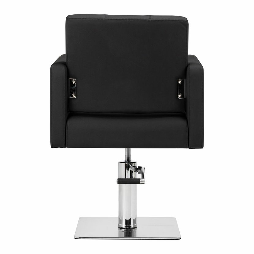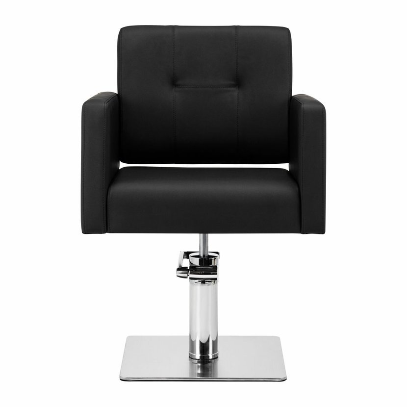 Klasické, pohodlné černé kadeřnické nebo holičské křeslo Bergamo . Má hydraulickou bázi, která umožňuje nastavit výšku židle.