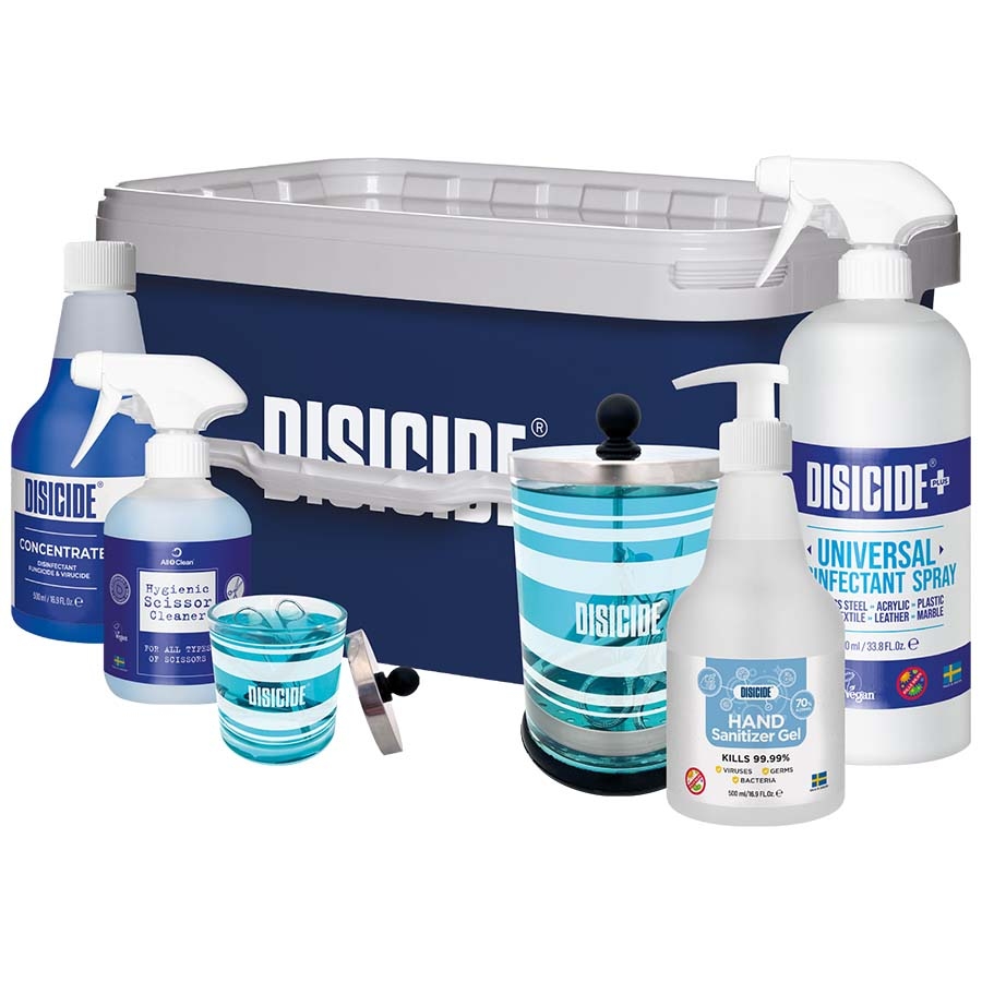 Značka Disicide představuje sadu obsahující dezinfekční přípravky pro kadeřnické provozovny a barber shopy. V sadě naleznete 6 prostředků pro dezinfekci pokožky, povrchů a nástrojů. Neobsahuje alkohol (kromě gelu na ruce).