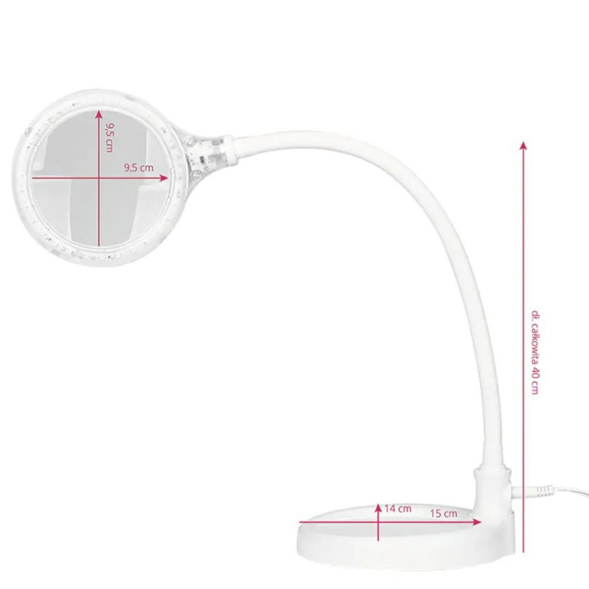 Elegante 2014-2r lampa s lupou, se vyznačuje velmi nízkou spotřebou energie a SMD LED (přibližně 4000 pracovních hodin). Umožňuje zobrazení ve zvětšení (5D lupa) a poskytuje vynikající osvětlení. Používá se také pro manikúru a pedikúru, permanentní make-up a depilaci. Antireflexní sklo nezpůsobuje bolest očí při dlouhodobé práci. Univerzální podstavec umožňuje položit jej na podlahu, na stůl nebo pomocí svěráku připevnit na pracovní desku.