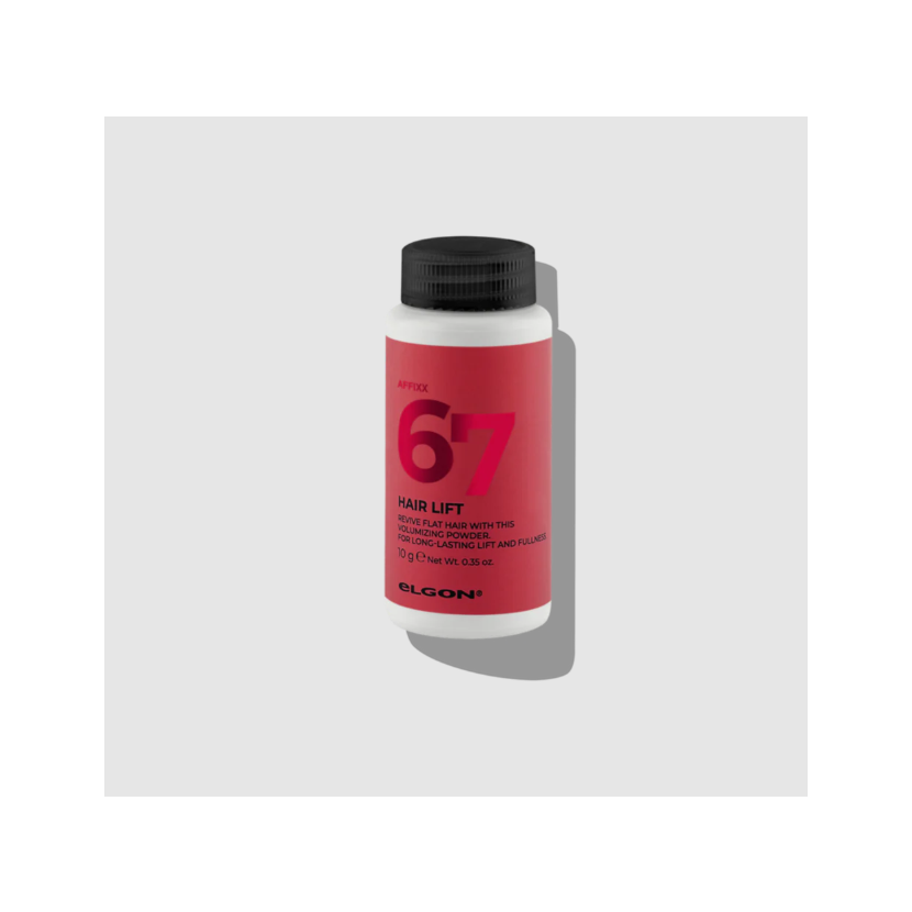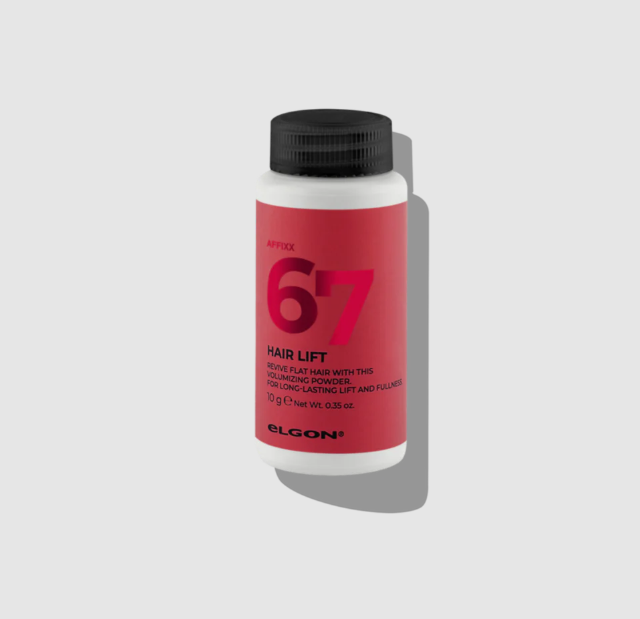 Elgon Affixx 67 Hair Lift je pudr pro objem vlasů. Pudr dokáže během pár vteřin vyčarovat texturu a okamžitý objem. Díky praktickému dávkovači se tento objemový pudr snadno používá a je ideální pro strukturovanější účesy. Navíc je jeho složení obohaceno o komplex Vitality Shield, který chrání vlasy před vnějšími agresivními vlivy.