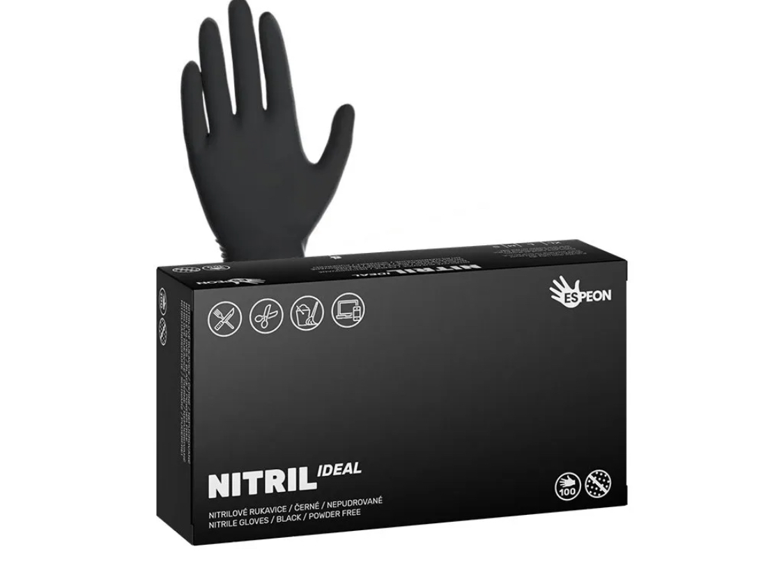 Espeon Nitrilové nepudrované rukavice v černé barvě. V balení je 100 kusů rukavic. Jsou vyrobeny ze 100% syntetického nitrilu. Rukavice neobsahují pudr ani latex. Mají zdrsněné konečky prstů pro lepší úchop a citlivost. Velmi příjemně se nosí a nezpůsobují alergické reakce. Mají vnitřní povrchovou úpravu pro rychlé a snadné nasazení. Dále mají zvýšenou odolnost proti mnoha chemickým látkám.