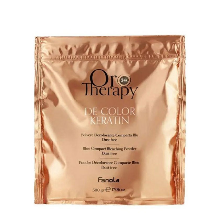 Fanola Oro Therapy De-Color Keratin je modrý melírovací prášek s keratinem a arganovým olejem, vhodný pro všechny typy zesvětlení až o 7 odstínů.