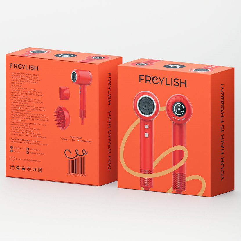 Značka Freylish představuje profesionální ionizační fén Freylish Pro, který zaujme moderním designem, kompaktními rozměry a výkonným BLDC motorem o výkonu 1600 W. Motor dosahuje rychlosti až 110 000 ot./min., což vytváří silný proud vzduchu o rychlosti 79,2 km/h pro mimořádně rychlé, efektivní a šetrné vysoušení vlasů.