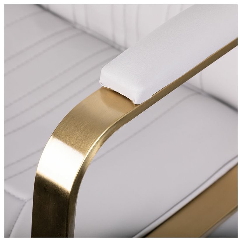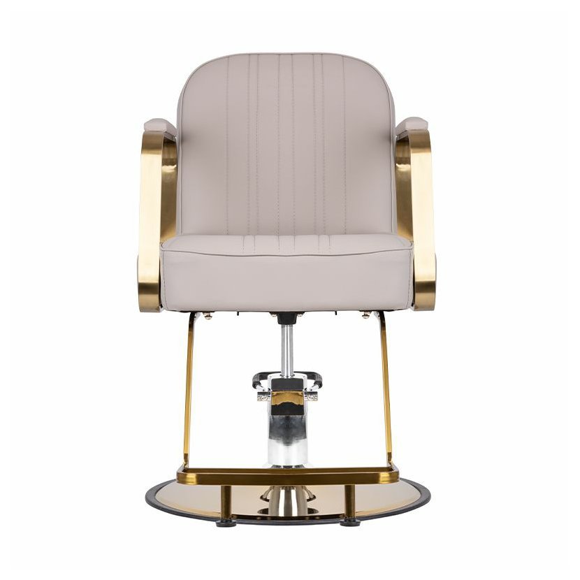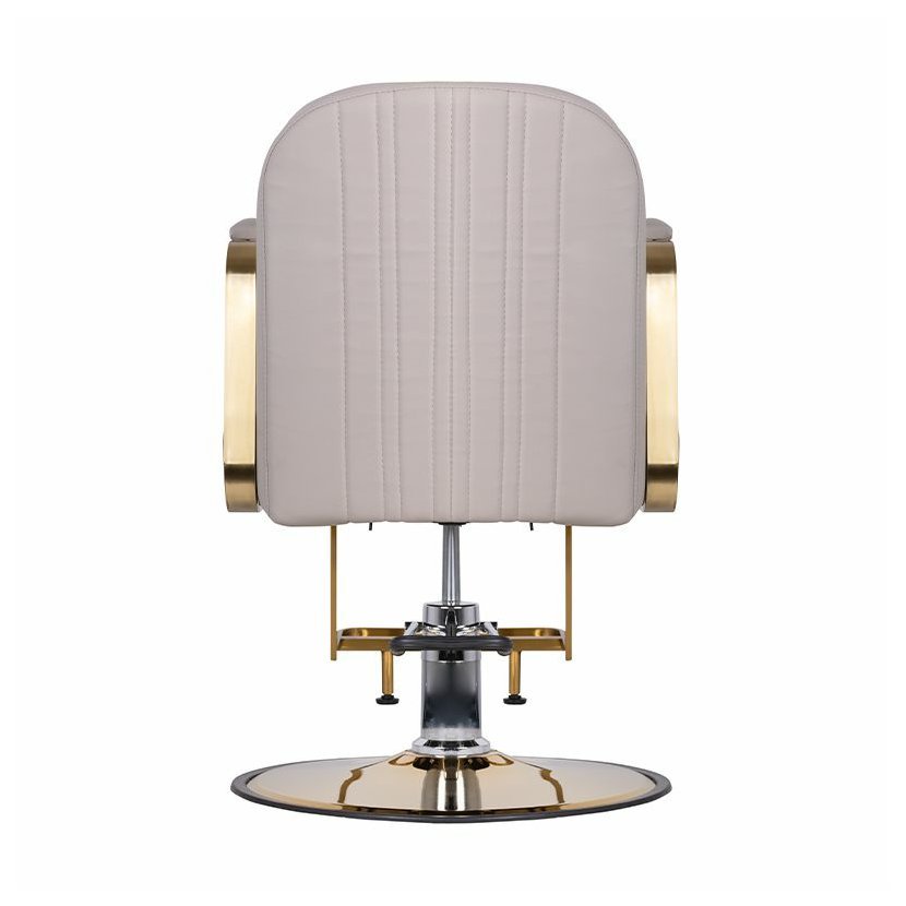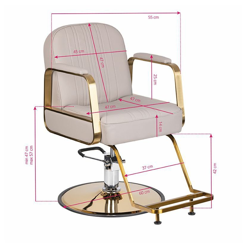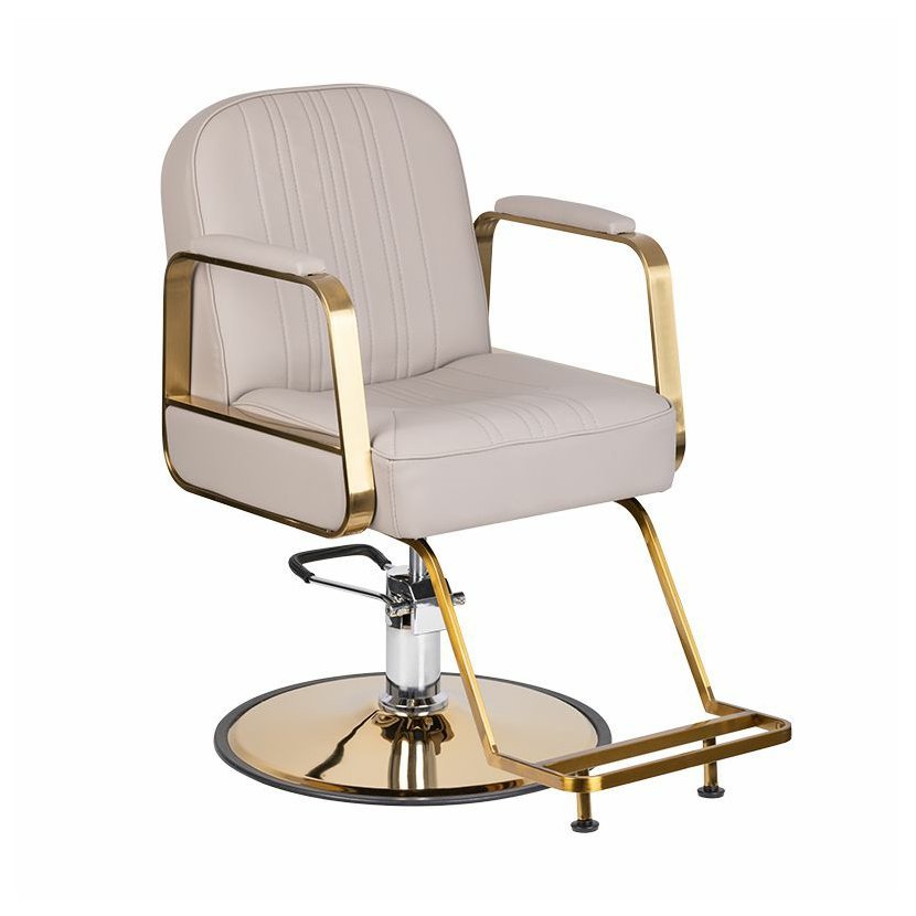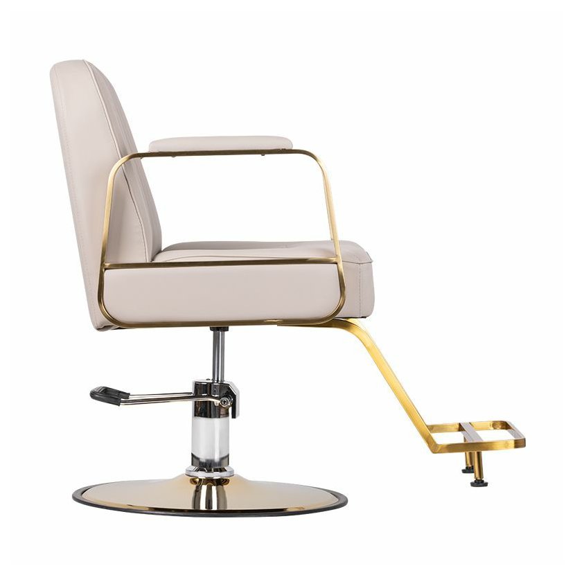 Stylové kadeřnické křeslo, které vypadá skvěle v každém salonu. Velmi pohodlné. Nastavitelné ve svislé rovině. Velmi stabilní a pevné. Čalounění je vyrobeno z nejkvalitnější béžové ekokůže. Eleganci tohoto křesla doplňuje zlatá povrchová úprava kovových prvků. Hydraulická báze zajišťuje pohodlný zdvih dle potřeby kadeřníka.