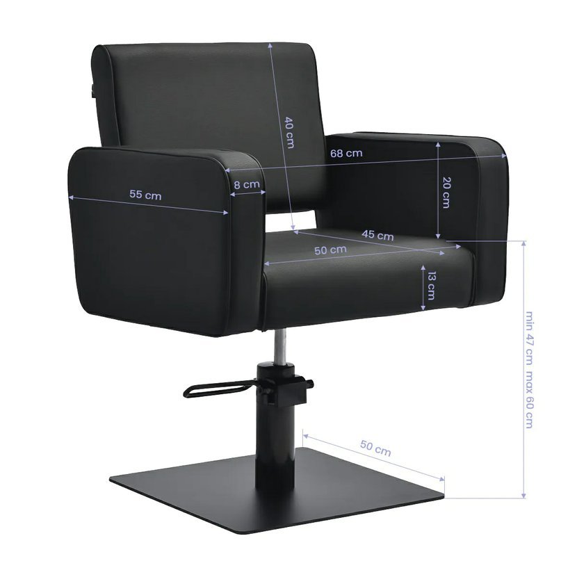 Moderní kadeřnické křeslo značky Gabbiano je elegantní a funkční a má nadčasový design. Vynikající propracování, materiály nejvyšší kvality ale i dokonalý vzhled. Křeslo je velmi pohodlné vhodné do malých ale i prostorných a luxusních salonů. Křeslo je regulovatelné a poskytuje zákazníkovi pohodlné sezení, ale i komfort kadeřnici během několikahodinové práce. Křeslo má nastavitelnou výšku pomocí hydraulické báze a to i když je klient usazen. Má matnou černou masivní základnu čtvercového tvaru.