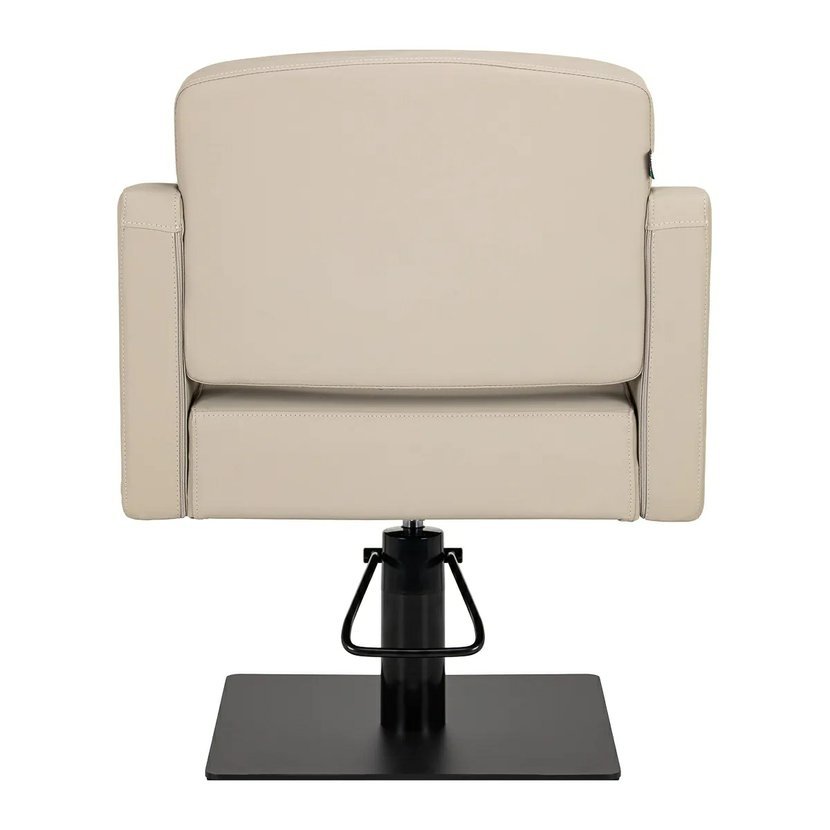 Hydraulický zdvih umožňuje plynulé nastavení výšky sedáku v rozmezí 42–60 cm, i když klient sedí v křesle. Stabilní čtvercová základna v matné černé barvě zajišťuje pevnost a bezpečnost během používání. Mechanismus plné rotace poskytuje volnost pohybu a pohodlí při práci.