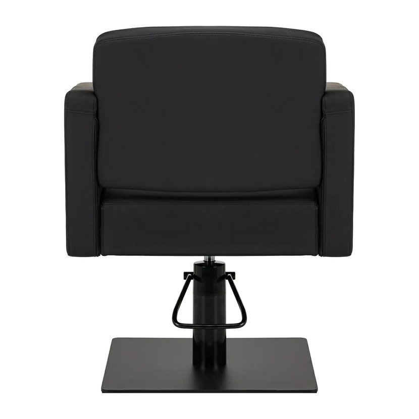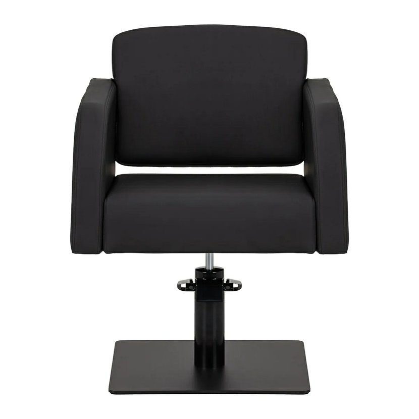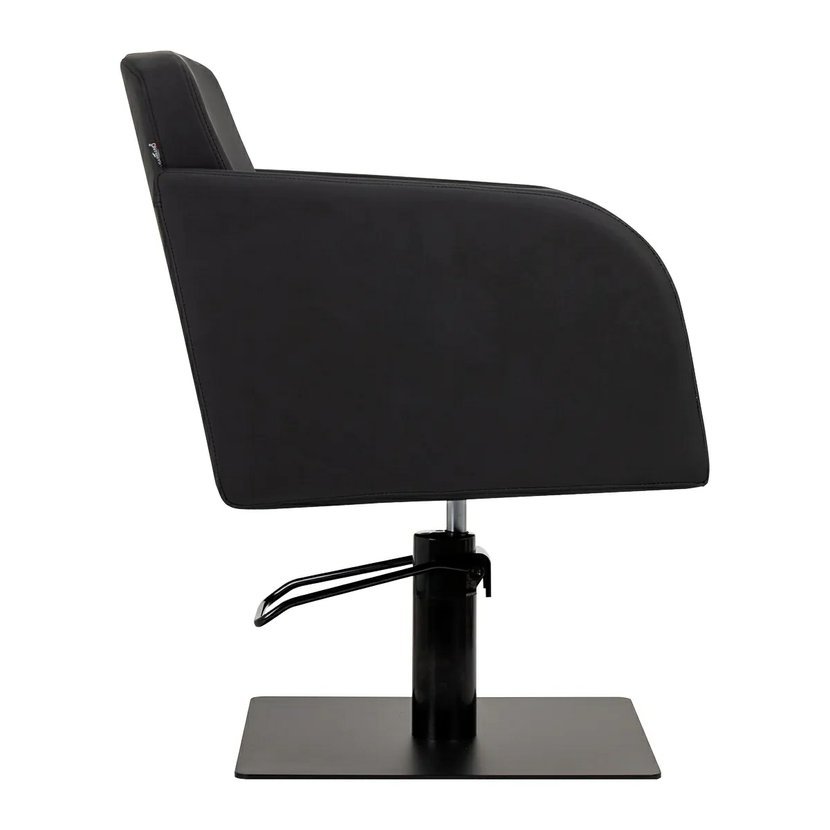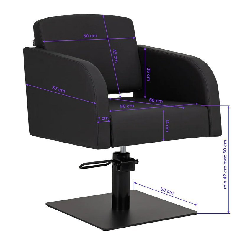 Hydraulický zdvih umožňuje plynulé nastavení výšky sedáku v rozmezí 42–60 cm, i když klient sedí v křesle. Stabilní čtvercová základna v matné černé barvě zajišťuje pevnost a bezpečnost během používání. Mechanismus plné rotace poskytuje volnost pohybu a pohodlí při práci.