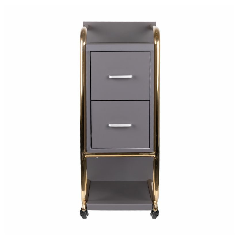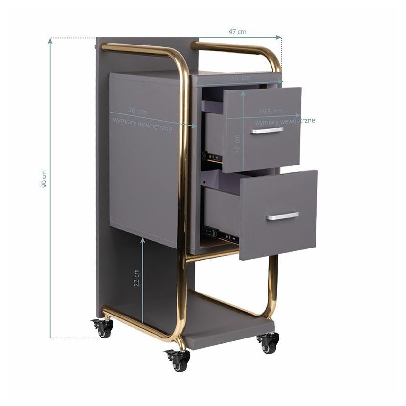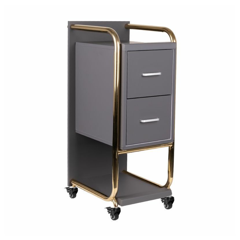 Vysoce kvalitní kadeřnický vozík, pomocník, Gabbiano Solo, ocelová konstrukce s tělem z dřevěných desek. Má dvě zásuvky a pogumovaná kolečka s brzdami.