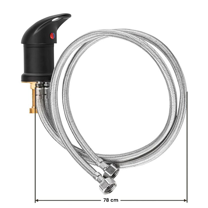 Směšovací baterie je nezbytným prvkem pro efektivní připojení přívodu vody ke kadeřnickému umyvadlu. Je vybavena dvěma připojovacími hadicemi chráněnými ocelovým opletením, což zaručuje vysokou odolnost. Standardní černá baterie je určena k instalaci na umyvadlovou mísu a je kompatibilní s většinou modelů dostupných na trhu.