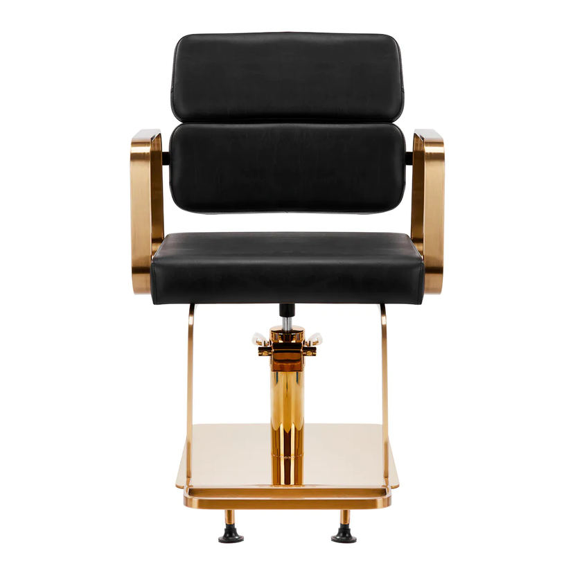 Plně otočný mechanismus, kterým je židle vybavena, zefektivňuje a zpříjemňuje práci kadeřníka. Pevná plochá základna čtvercového tvaru zaručuje stabilitu při používání. Matný, hladký povrch dodává křeslu elegantní vzhled a díky němu se toto křeslo snadno udržuje v čistotě. Pohodlné sedadlo s pěnovou výplní zajišťuje vysokou úroveň komfortu i při dlouhém používání. Geometrické kovové područky umožňují správnou polohu ramen klienta a znatelně tak usnadňují precizní ošetření, včetně stříhání vlasů. Stylová opěrka nohou určená pro tento model poskytuje stabilní oporu pro nohy uživatele.