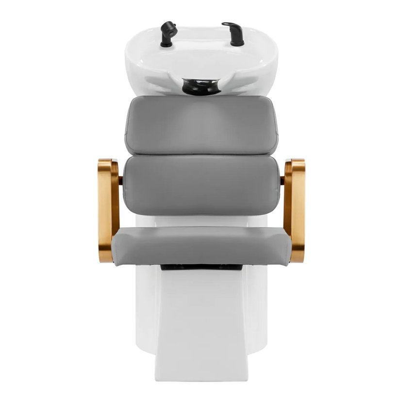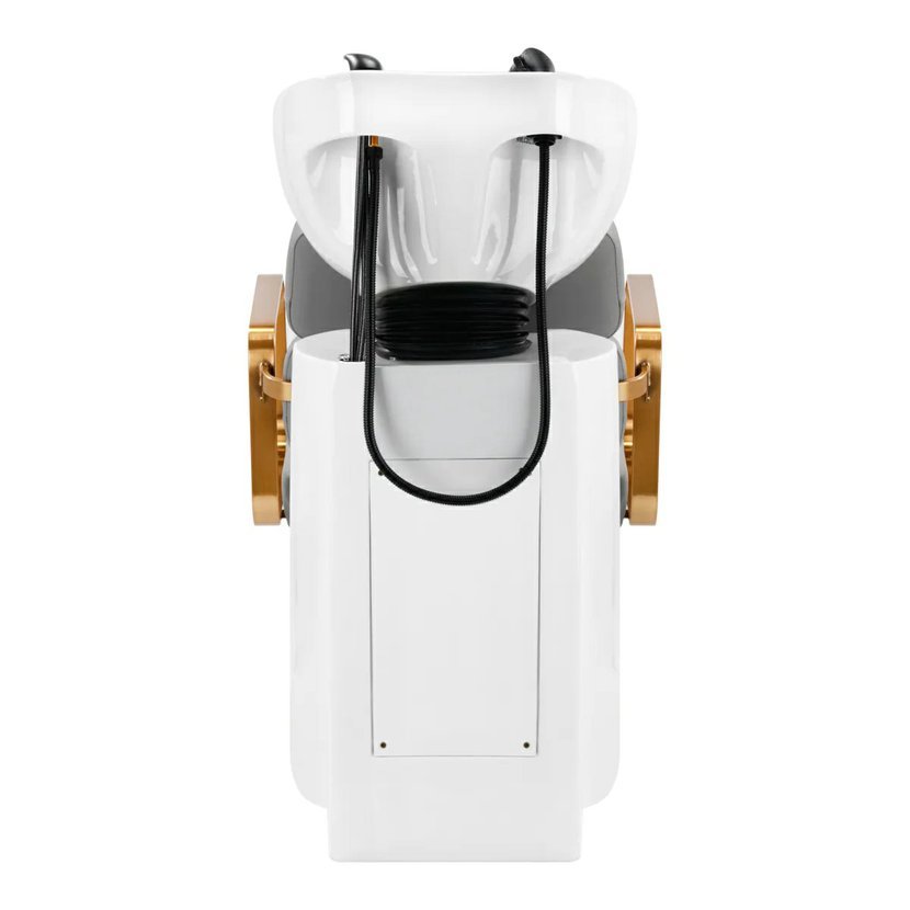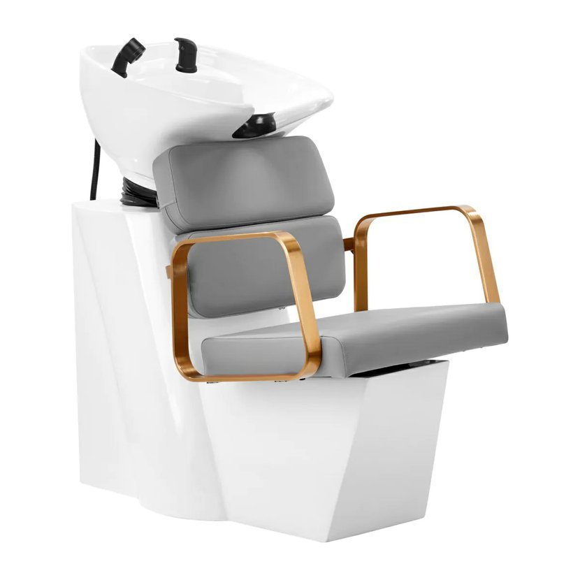Praktický mycí box je vybaven směšovací baterií, která umožňuje volný přístup k teplé a studené vodě. Díky tomu lze snadno nastavit teplotu podle individuálních preferencí zákazníka. Významnou výhodou tohoto modelu je otvor ponechaný mezi opěradlem a sedákem, který usnadňuje udržování čistoty v salonu a umožňuje snadné vymetení nečistot z každého zákoutí křesla. Mycí box je vyprofilován tak, aby zajistil pohodlí při různých procedurách a zaručil správnou oporu zad. Díky kombinaci funkčnosti a komfortu je práce v kadeřnickém salonu ještě pohodlnější.