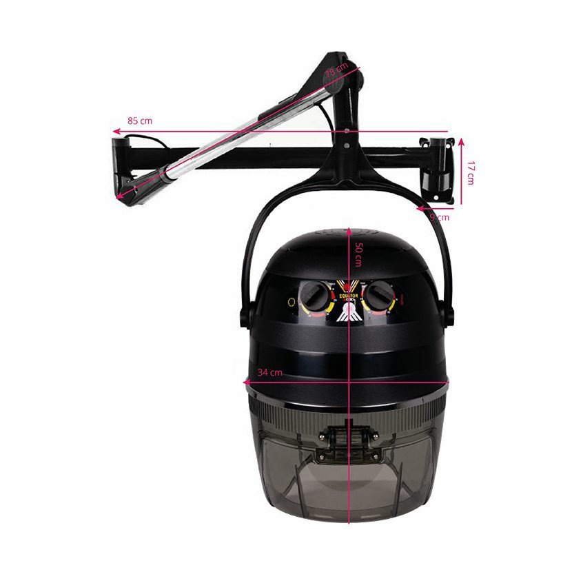 Sušící helma na vlasy je jedním z nejcharakterističtějších kadeřnických zařízení, tento model je základním provedením s 1 rychlostí. Rameno zajistí dostupnost přístroje kdy je potřeba. Rameno je dostatečně dlouhé a pevné. Topné těleso je schopno dosáhnout teploty horkého vzduchu 75 stupňů. Čas je možno regulovat stejně tak jako výšku sušáku od země, do stran nebo délku roztažení.
