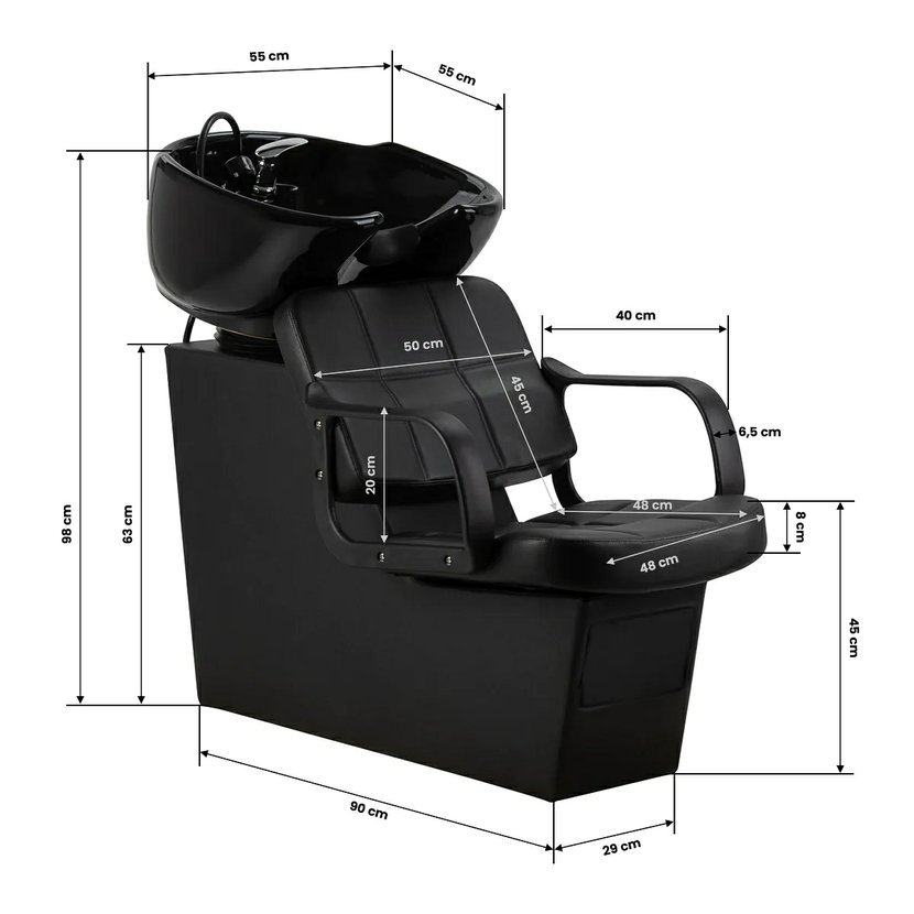 Moderní mycí box Hair System, který spojuje elegantní design s vysokou funkčností. Pohodlné a stabilní sedadlo spolu s možností nastavení sklonu mísy umožňují klientovi zaujmout komfortní polohu během mytí vlasů i dalších kadeřnických úkonů. Přívod vody je umístěn uvnitř základny, díky čemuž je instalace esteticky skrytá a pracovní místo působí čistě a profesionálně. Mycí box je navržen tak, aby poskytoval maximální komfort při různých vlasových ošetřeních. Kombinace ergonomických detailů a praktických řešení usnadňuje každodenní práci v kadeřnickém salonu. Čalounění křesla je vyrobeno z kvalitní syntetické kůže a keramická mísa je vybavena sprchovou hlavicí, baterií a odpadem.
