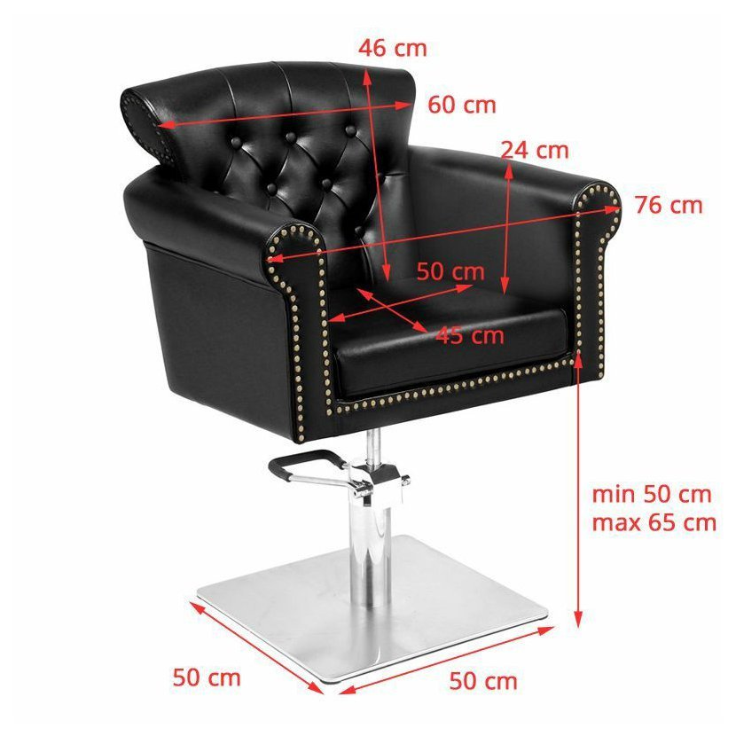 Stylové kadeřnické křeslo. Velmi pohodlné, dokonale odpovídající interiérům elegantních salonů. Nastavitelné ve svislé rovině díky hydraulické bázi. Je velmi stabilní a spolehlivé, potaženo vysoce kvalitní eko kůží. Zajímavé designové prvky doplňuje čtvercová základna vyrobená z vysoce kvalitní oceli Inox.