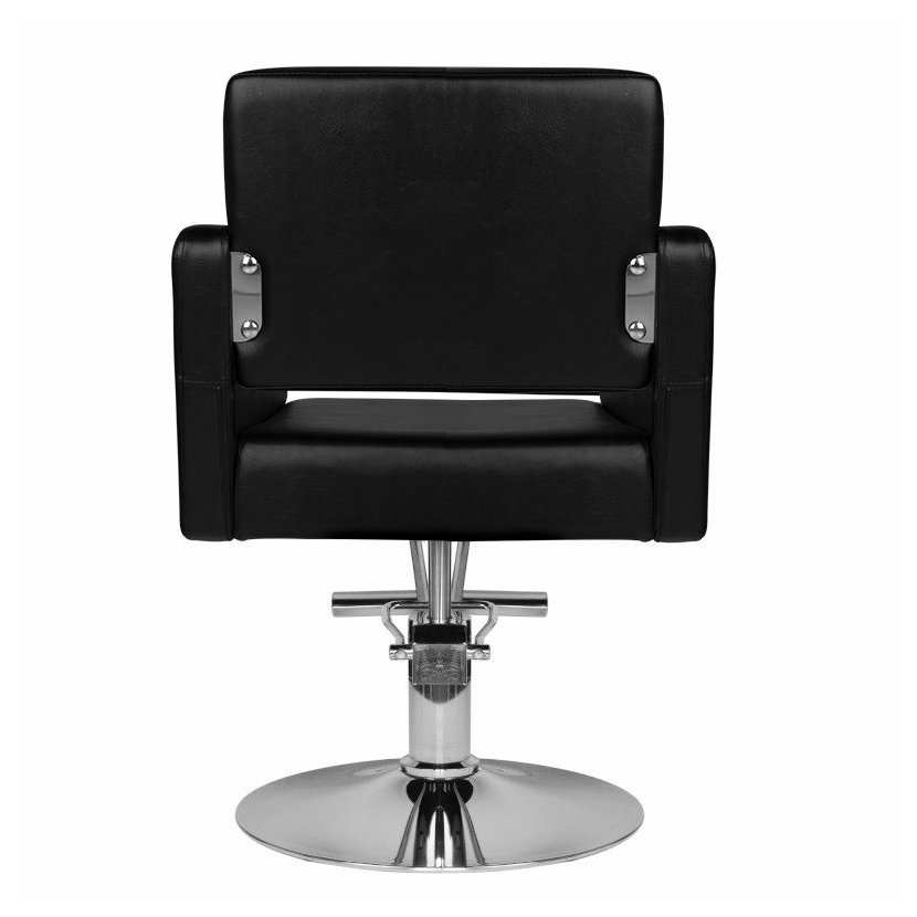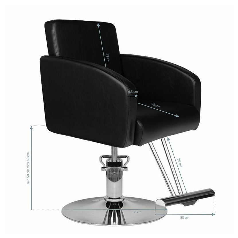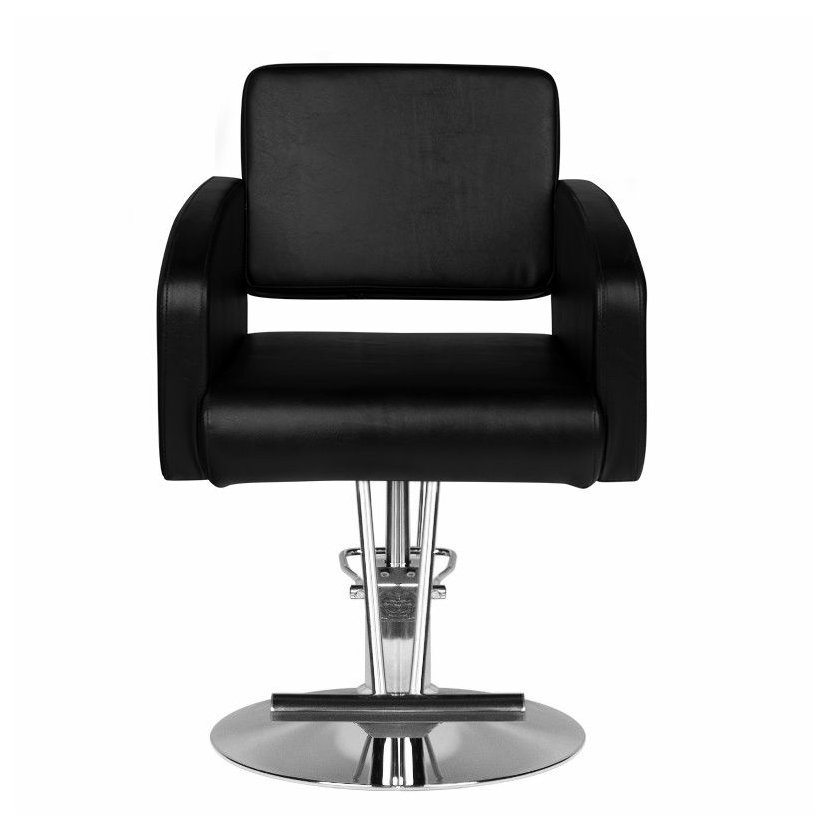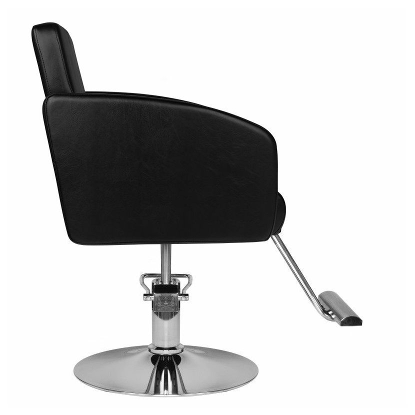 Moderní kadeřnické křeslo HAIR SYSTEM. Příjemné a velmi pohodlné. Pevná chromovaná základna zaručuje stabilitu křesla. Čalounění je vyrobeno z kvalitní černé ekologické kůže, takže se snadno udržuje v čistotě. Hydraulika umožňuje nastavení výšky, pohodlné sezení zajišťuje také podnožka pod nohy.