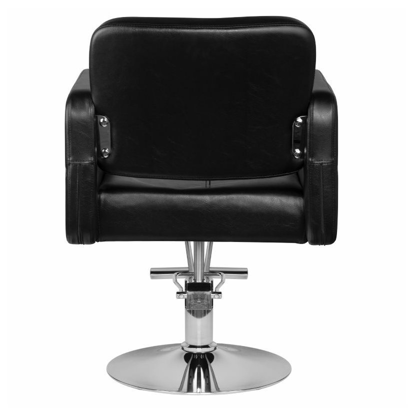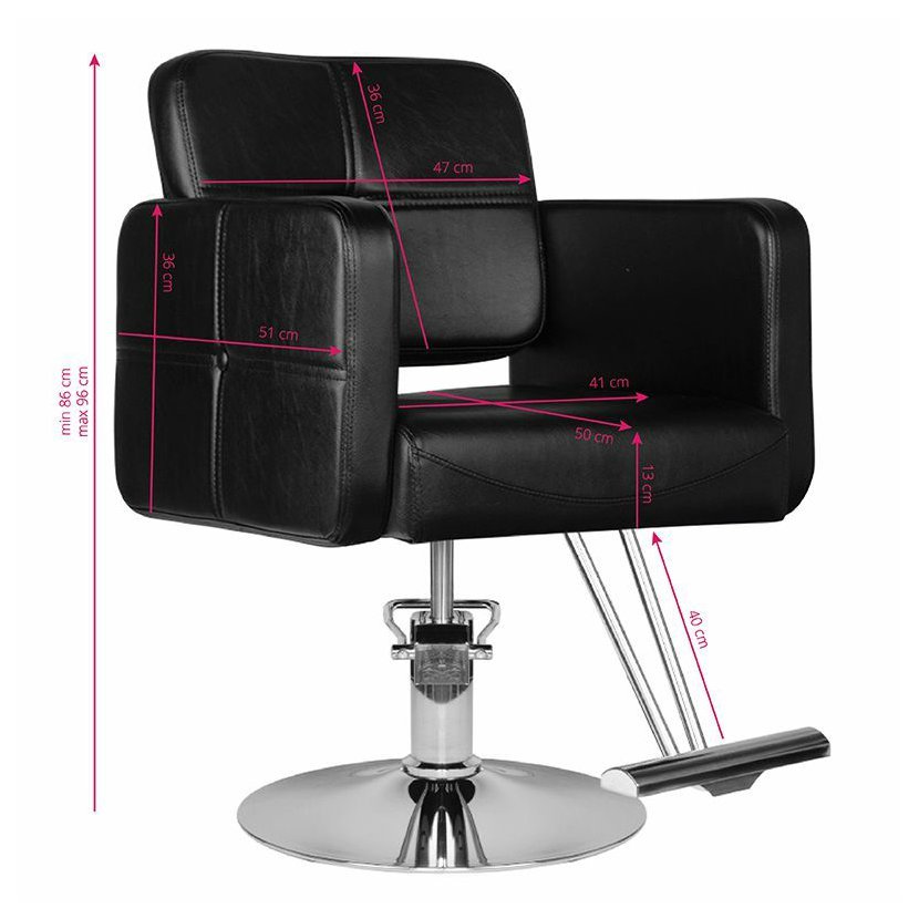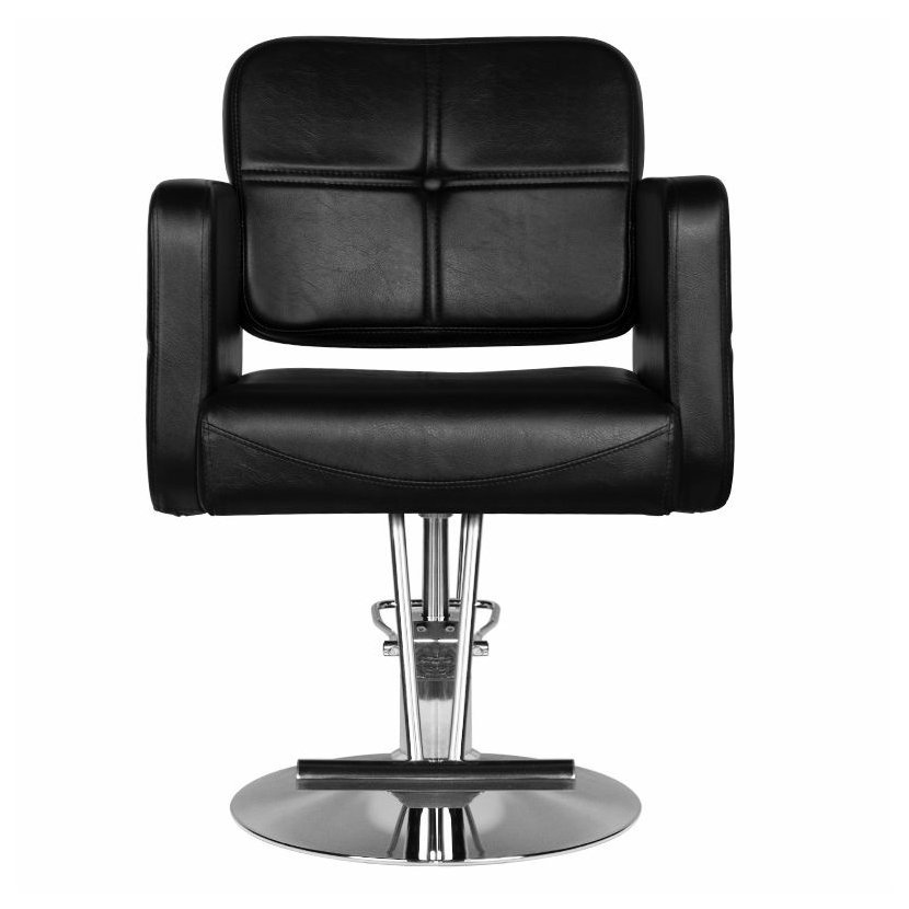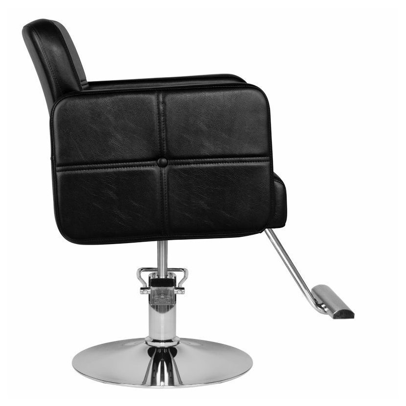 Moderní kadeřnické křeslo HAIR SYSTEM. Příjemné a velmi pohodlné. Pevná chromovaná základna zaručuje stabilitu křesla. Čalounění je vyrobeno z kvalitní černé ekologické kůže, takže se snadno udržuje v čistotě. Hydraulika umožňuje nastavení výšky, pohodlné sezení zajišťuje také podnožka pod nohy.