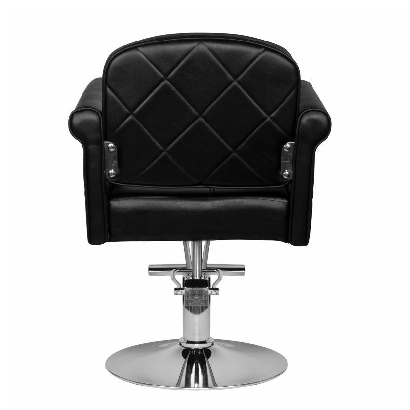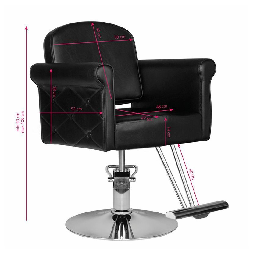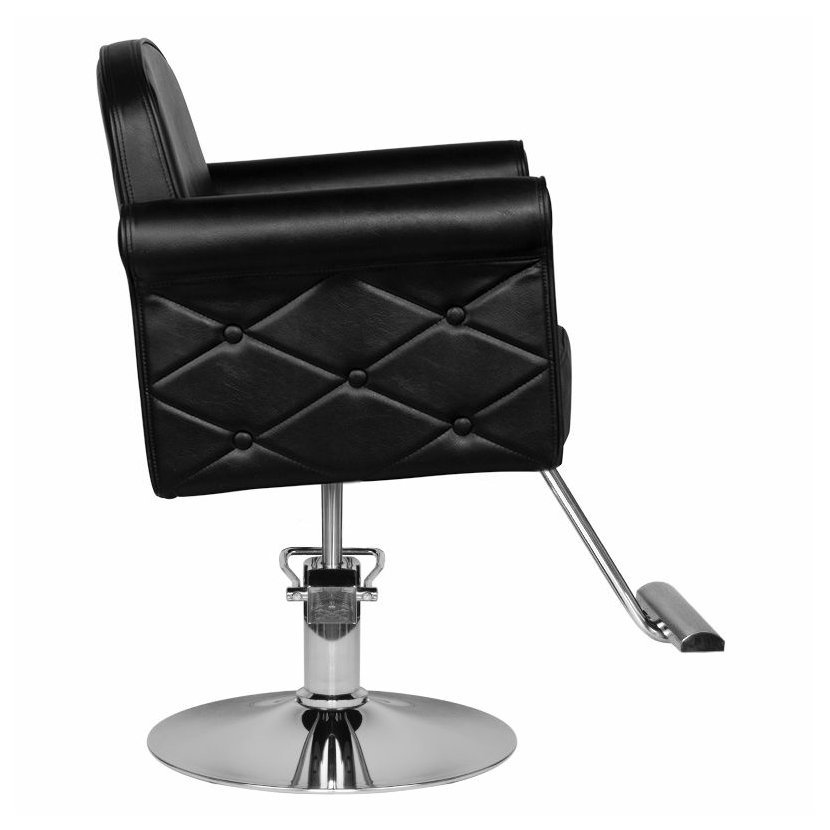 Moderní kadeřnické křeslo HAIR SYSTEM. Příjemné a velmi pohodlné. Pevná chromovaná základna zaručuje stabilitu křesla. Čalounění je vyrobeno z kvalitní černé ekologické kůže, takže se snadno udržuje v čistotě. Hydraulika umožňuje nastavení výšky, pohodlné sezení zajišťuje také podnožka pod nohy.