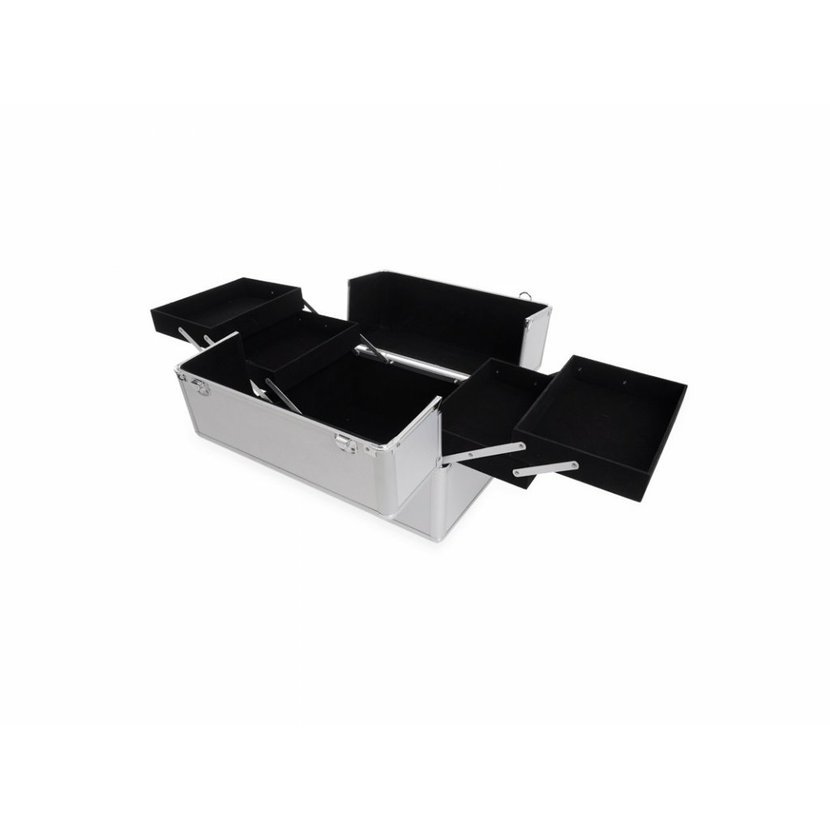 Ideální pro kadeřnice dojíždějící za klienty, hliníkový rám. Navržen tak, aby se do něj vešlo veškeré potřebné příslušenství. Uprostřed jsou výsuvné police a pod nimi velký prostor. Vnitřek je vystlán černým sametem, příjemným na dotek. Kufřík je zamykatelný klíčkem.
