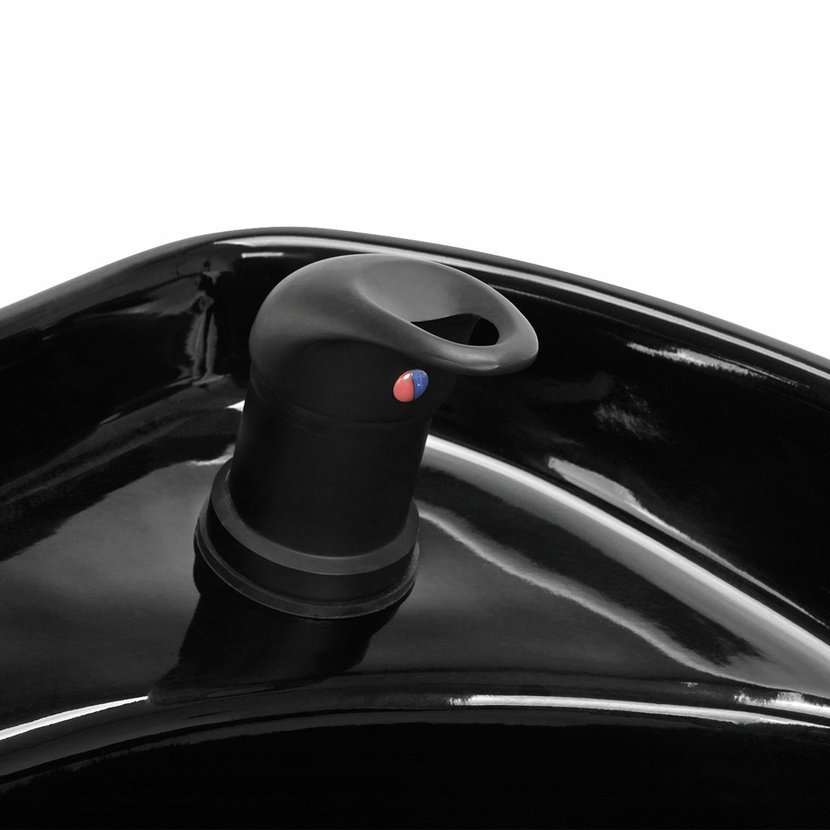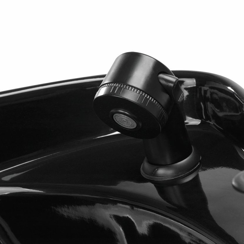 Černá keramická umyvadlová mísa s vhodnou hloubkou zabraňuje nadměrnému stříkání vody a přípravků používaných při ošetření a umožňuje komfortní výkon celé řady služeb . Možnost nastavení úhlu sklonu mísy umožňuje přizpůsobit nastavení individuálním potřebám . Použitý materiál činí umyvadlo trvanlivé, odolné proti zabarvení a poškrábání a velmi snadno se čistí . Správně profilovaný límec poskytuje oporu a pohodlí při mytí vlasů a díky pohodlnému plastovému potahu zákazník nepocítí nepříjemnosti studeného keramického povrchu .