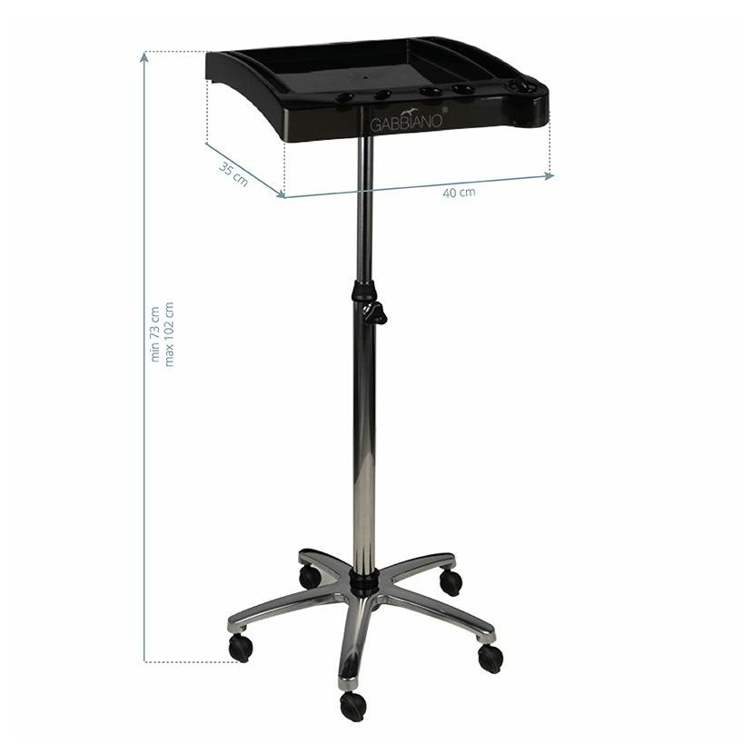 Kadeřnický pomocník v černé barvě, má spoustu úložného místa na kadeřnické vybavení. Stabilní konstrukce zaručí dlouhou životnost. Pomocník je osazen pogumovanými kolečky, díky tomu budou nástroje vždy po ruce.