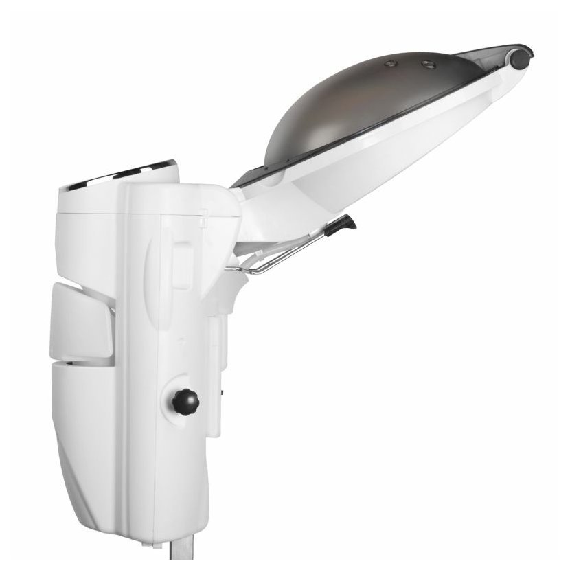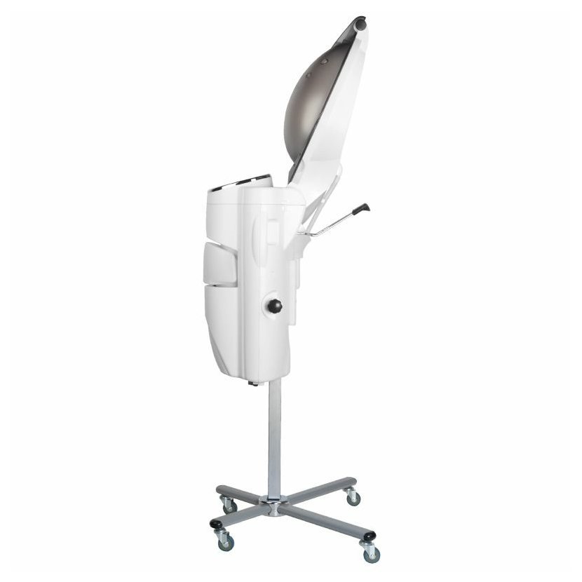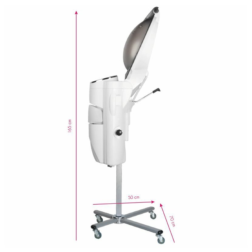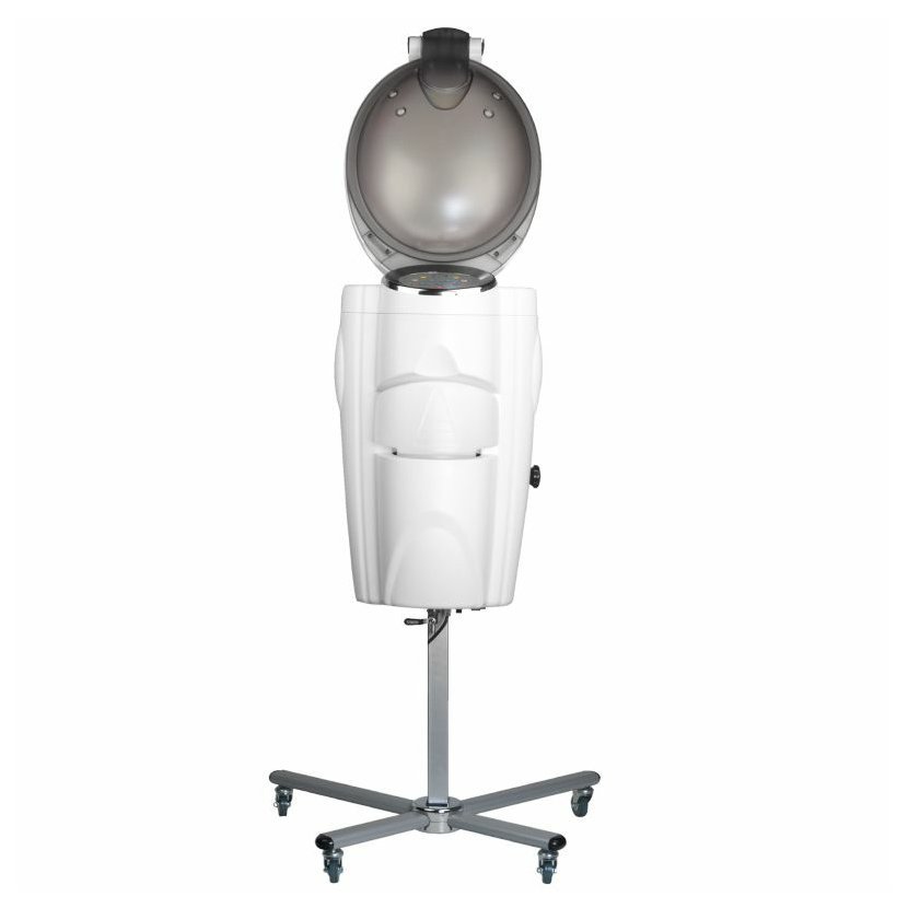 Gabbiano parní sauna na stativu s nastavitelnou výškou s aktivní ozonací. Jedná se o inovativní zařízení pro obnovu hlubokých struktur vlasů. Teplá vodní pára produkovaná zvlhčovačem vlasů / saunou umožňuje rozšiřování vlasových mikrobuněk, což usnadňuje důkladnější vstřebávání látek obsažených v různých typech kadeřnických regeneračních přípravků.