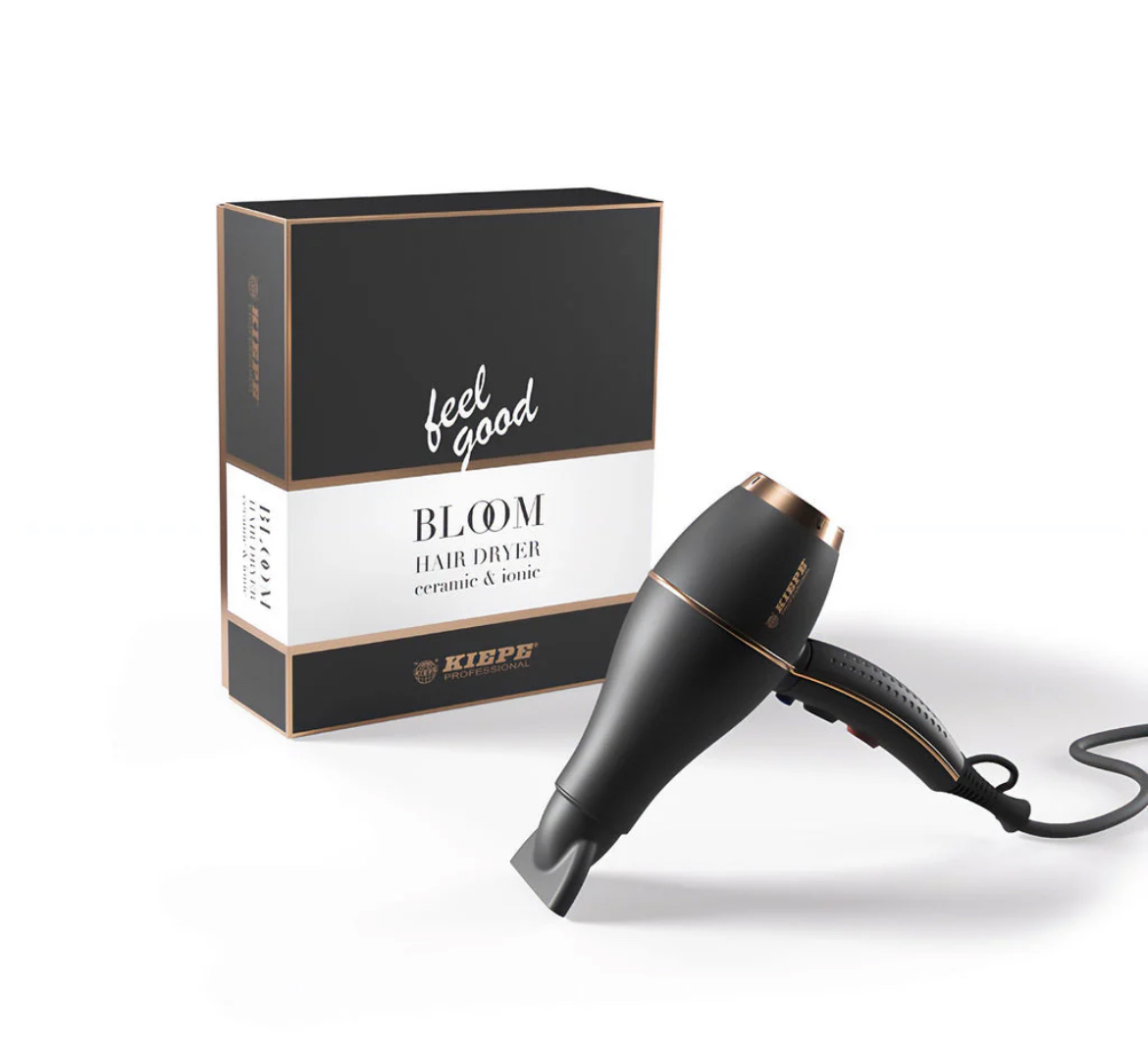 Kiepe fén na vlasy Hairdryer Bloom Edition s výkonným AC motorem (životnost 2000 hodin) a širokým rozsahem proudění vzduchu. Má keramickou a ionizační technologii, která vlasy uhladí a eliminuje jejich krepatění. Rychlé vysoušení vlasů je zajištěno výkonem 2000 W. Fén má ergonomickou rukojeť pro snadnou manipulaci. Možnost nastavení dvou rychlostí sušení, dvou stupňů teploty a studeného vzduchu pro fixaci účesu. Fén má hmotnost pouhých 560 g.