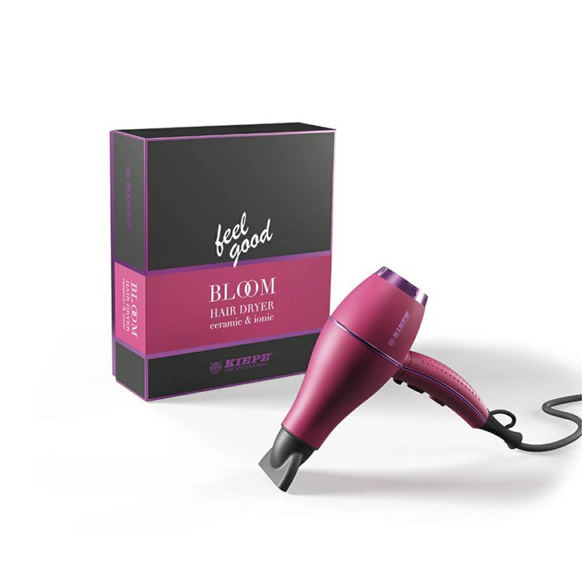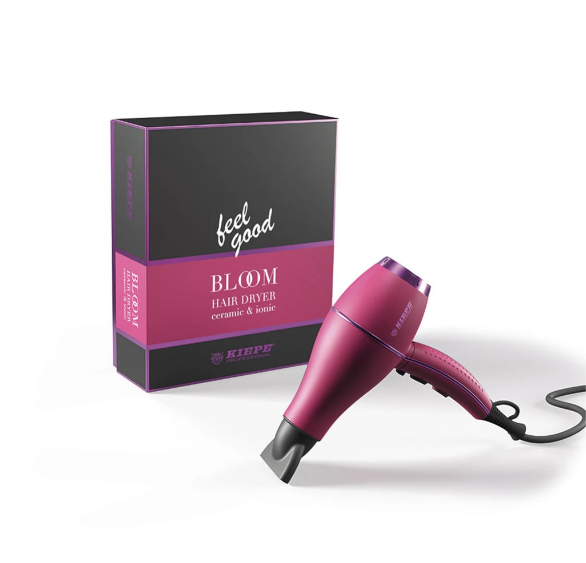 Kiepe fén na vlasy Hairdryer Bloom Edition s výkonným AC motorem (životnost 2000 hodin) a širokým rozsahem proudění vzduchu. Má keramickou a ionizační technologii, která vlasy uhladí a eliminuje jejich krepatění. Rychlé vysoušení vlasů je zajištěno výkonem 2000 W. Fén má ergonomickou rukojeť pro snadnou manipulaci. Možnost nastavení dvou rychlostí sušení, dvou stupňů teploty a studeného vzduchu pro fixaci účesu. Fén má hmotnost pouhých 560 g.