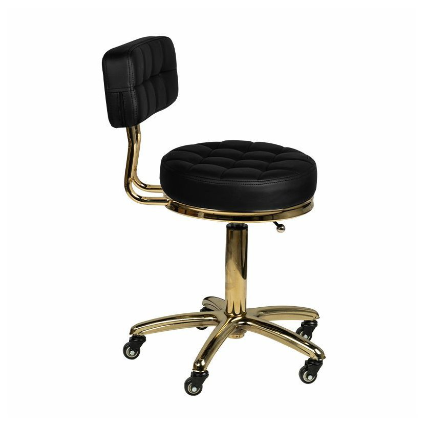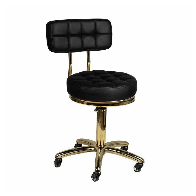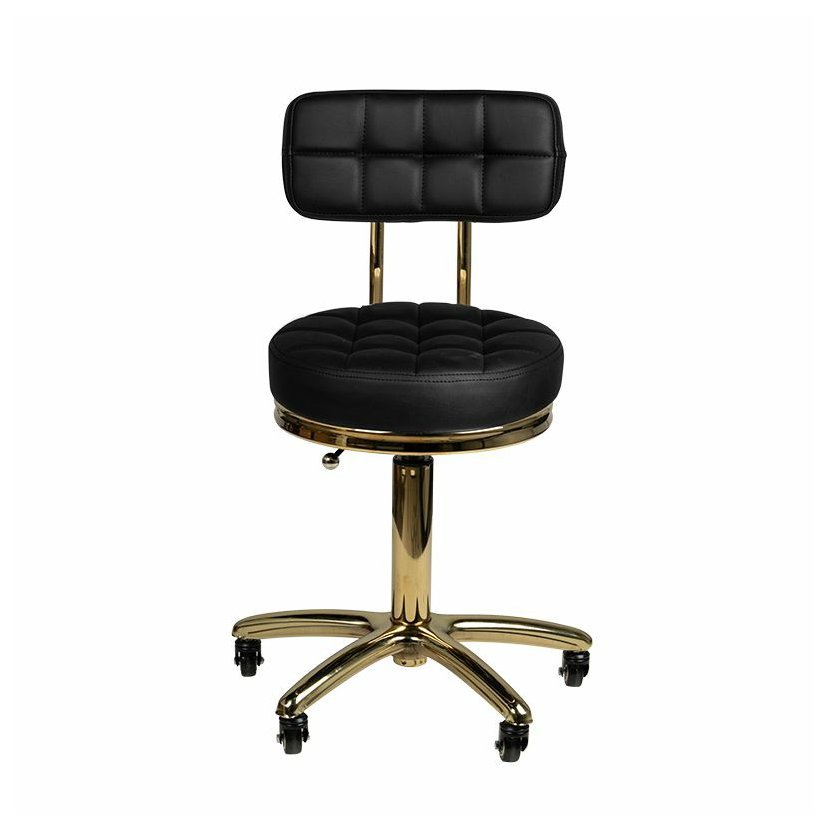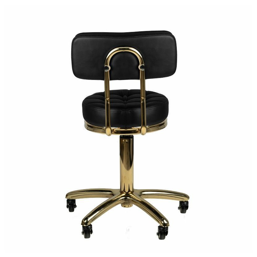 Unikátní černý kosmetický nebo kadeřnický taburet s prošívaným sedákem a pohodlným opěradlem. Kovové prvky jiskří zlatou barvou. Je výškově nastavitelný a základna je vybavena pevnými kolečky z gumy.