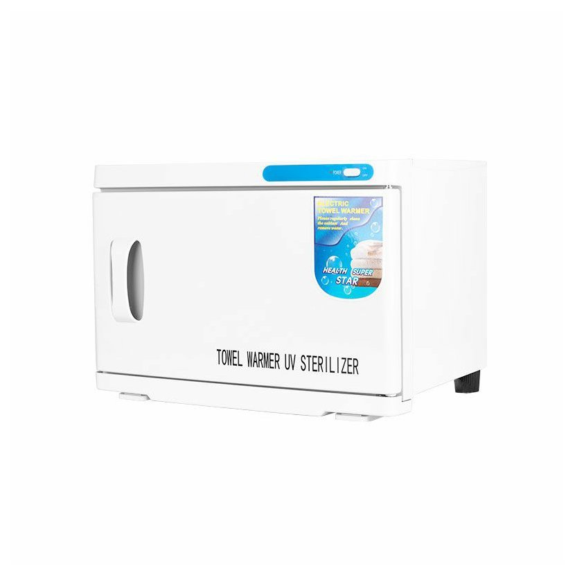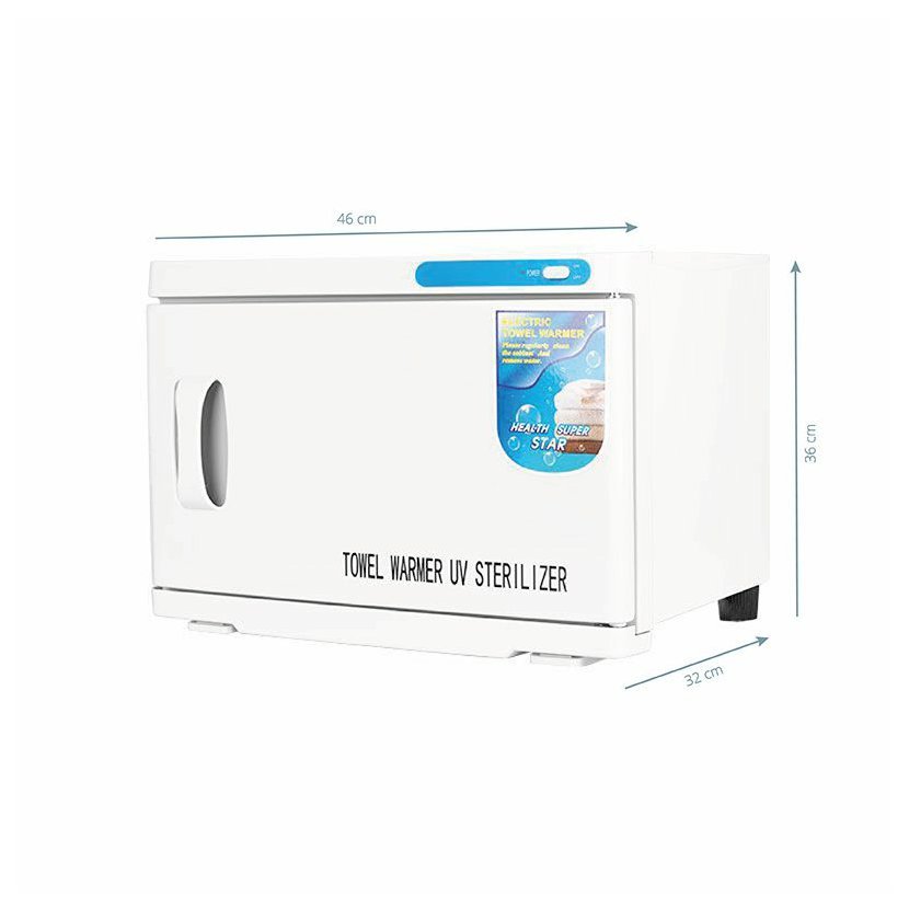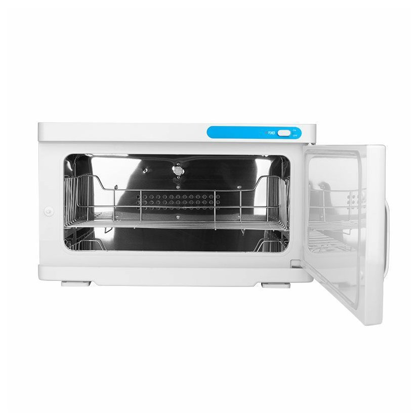 Profesionální nahřívač ručníků s UV-C sterilizátorem, užitečný ve SPA, větších kosmetických salonech, masážních salonech a barber shopech. Velké vnitřní rozměry umožňují umístit asi tucet ručníků různých velikostí. Zařízení má senzor, který deaktivuje sterilizátor při otevření dveří.