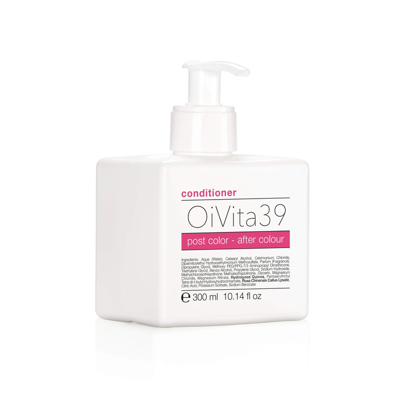 OiVita39 After Colour Conditioner je kondicionér pro barvené a chemicky ošetřené vlasy s revitalizačním účinkem. Usnadňuje rozčesávání vlasů. Obsahuje quinou a výtažek z růže, který dodává vlasům lesk a zároveň je uzavírá, čímž prodlužuje efekt barvených vlasů.
