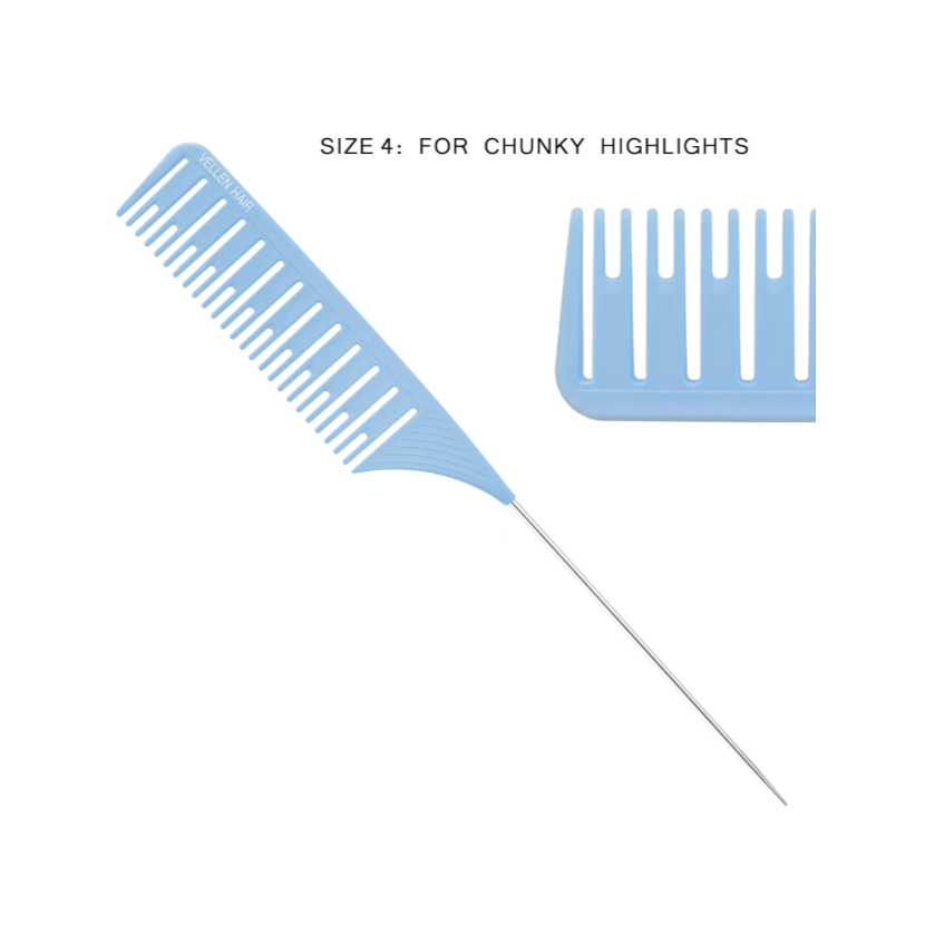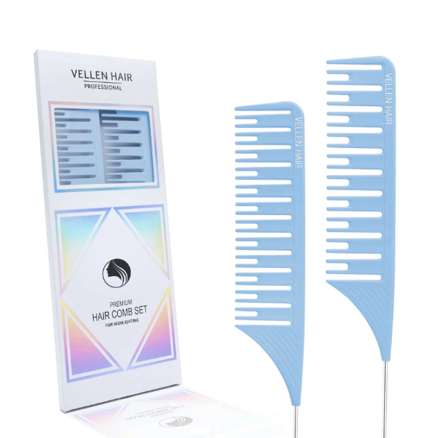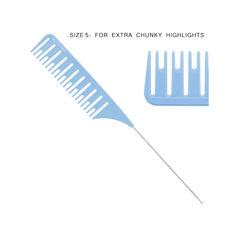 Patentovaný Vellen Hair Ultimate Highlighting Comb snižuje váš pracovní čas až o 1,5 hodiny! Dodává se ve 2 velikostech s přizpůsobeným rozestupem zubů a oddělením linií. Extra dlouhý hrot z nerezové oceli, lehký design a pohodlná rukojeť, která se nesmeká při držení. Statické plastové materiály ULTEM pomáhají předcházet vzniku statické energie a krepatění. Navržen s postupně klesajícím sklonem, hřeben usnadňuje rovnoměrné napnutí vlasů a pomáhá vytvářet dokonalé oddělení vlasových partií.