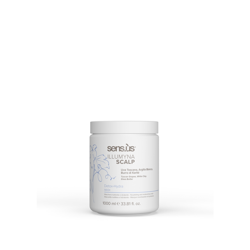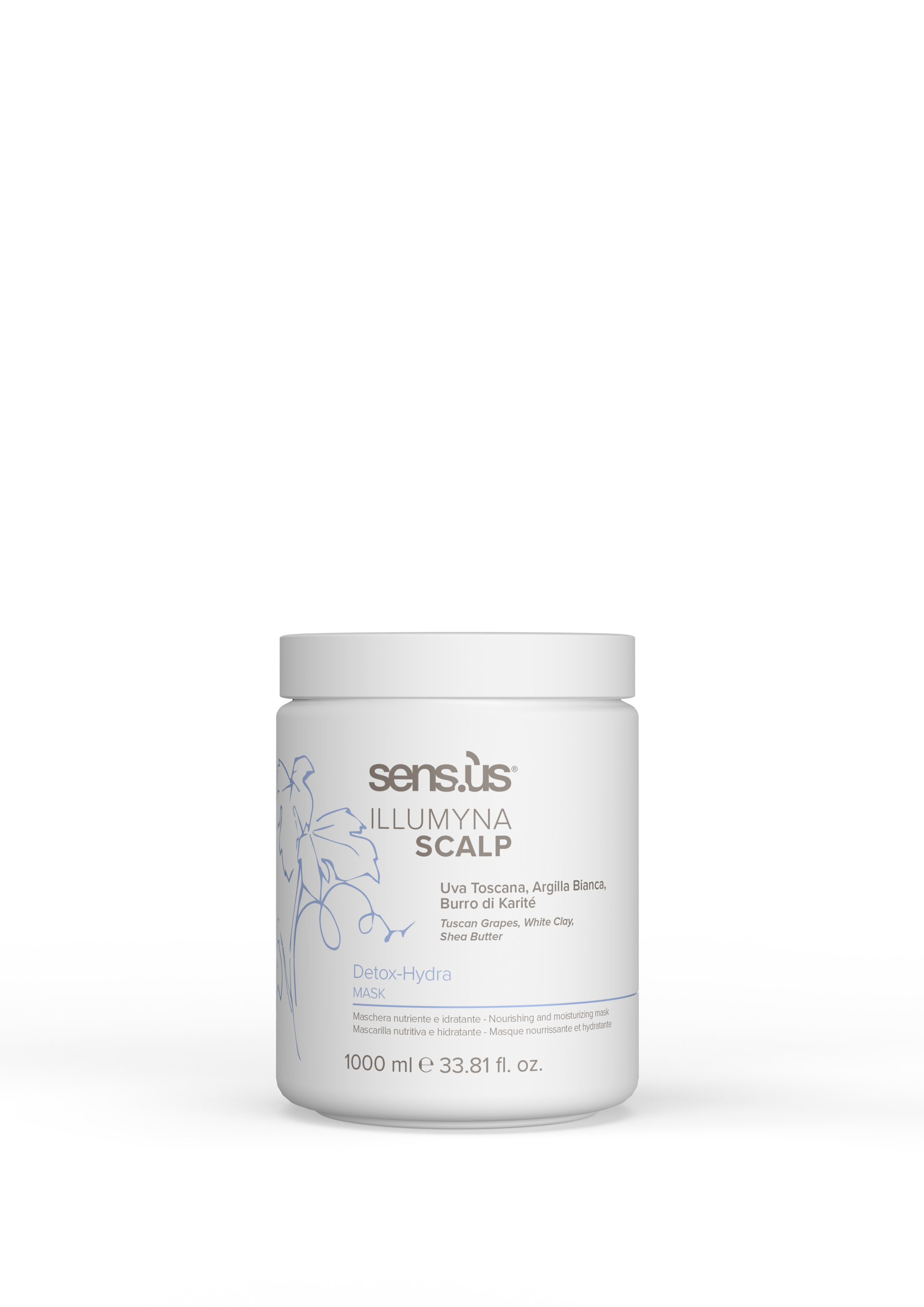 Sens.us Illumyna Scalp Detox Hydra Mask je maska, která zároveň detoxikuje pokožku a hydratuje. Obsahuje výtažky z toskánských hroznů, bílý jíl a bambucké máslo. Maska díky obsaženému bílému jílu urychluje následné vysoušení vlasů. Toskánské hrozny mají antioxidační účinky. Bílý jíl pomáhá odstraňovat nadbytečný kožní maz a nečistoty, ale současně vrací minerální látky zpátky do kůže, dále absorbuje vlhkost. Bambucké máslo má zvláčňující, tonizační a antioxidační účinky, navíc poskytuje vlasům SPF ochranu. Tuto masku můžete aplikovat od kořínků vlasů až po konečky.