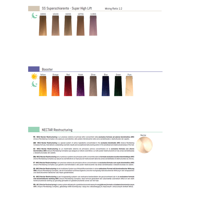Aktivní revitalizační komplex (ARC) - Ucelený systém koncentrovaných aktivních složek s regeneračním účinkem v exkluzivním složení a s biomimetickým účinkem. Při přimíchání ke kterémukoliv z odstínů barvy MC2 Hair Color působí jako opravdový a skutečný regeneračně barvící přípravek, rozšiřuje a zdůrazňuje kosmetický účinek v případech, kdy se jedná o vlasy značně přecitlivělé nebo s poškozenou strukturou.