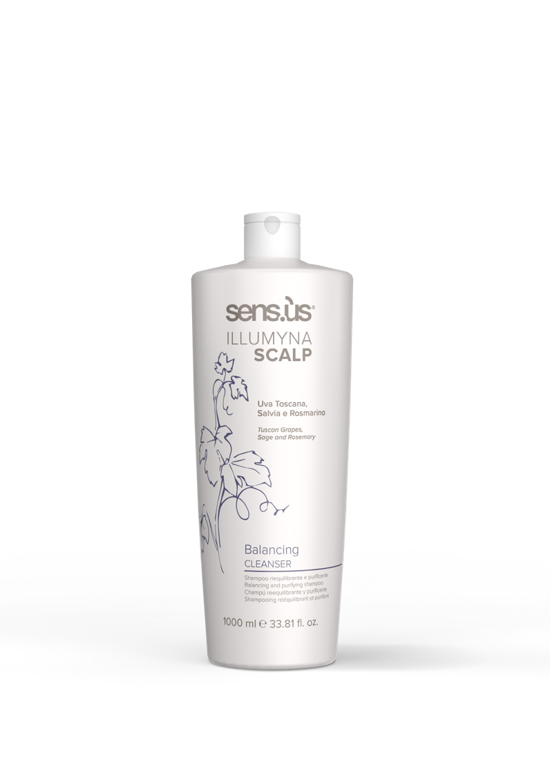 Sens.us Illumyna Scalp Balancing Cleanser je vyrovnávací a čistící šampon, který pomáhá odstranit nečistoty a přebytečný maz z pokožky hlavy. Je obohacen o výtažky z toskánských hroznů, šalvěj a rozmarýn. Je ideální pro tenké a mastné vlasy. Toskánské hrozny mají antioxidační účinky. Šalvěj reguluje tvorbu kožního mazu, poskytuje vlasům sílu, hydrataci a dodává jim přirozený lesk. Šalvěj napomáhá zklidnit podrážděnou vlasovou pokožku a stimuluje růst vlasů. Rozmarýn má zklidňující a antioxidační účinky. Posiluje vlasová vlákna od kořínků. Zamezuje svědění pokožky hlavy a eliminuje tvorbu lupů.