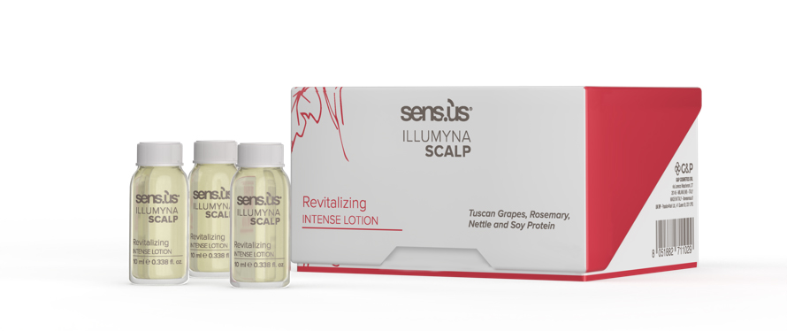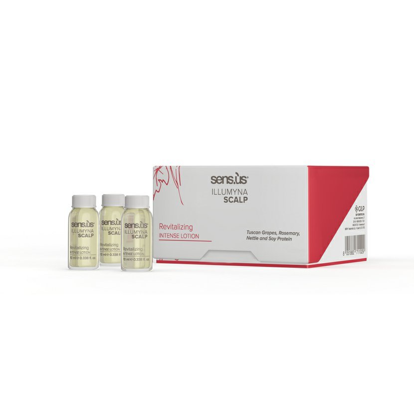 Sens.us Illumyna Scalp Revitalizing Intense Lotion je posilující intenzivní sérum, které slouží jako prevence proti vypadávání vlasů. Sérum je obohaceno o hydrolyzovaný sójový protein a výtažky z hroznů, rozmarýnu a kopřivy. Toskánské hrozny mají antioxidační účinky. Rozmarýn má zklidňující a antioxidační účinky. Posiluje vlasová vlákna od kořínků. Zamezuje svědění pokožky hlavy a eliminuje tvorbu lupů. Kopřiva vlasovou pokožku zklidní, vyčistí a udržuje ji bez lupů. Stimuluje růst vlasů. Sójový protein vyživuje vlasy od kořínků.