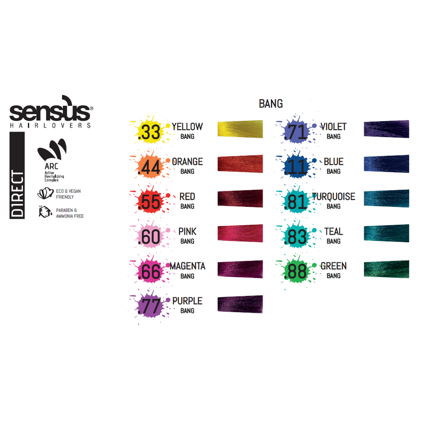Sensus Direct Bang je přímý barvící pigment na vlasy. Exkluzivní receptura, obohacená o ARC (aktivní revitalizační komplex), poskytuje pestré dlouhotrvající odstíny. Aktivní revitalizační komplex (ARC) je směs biomimetických rostlinných aminokyselin napodobuje činnost keratinové struktury vlasů. Posiluje a omlazuje vlasy. Má regenerační, multifunkční účinek optimalizovaný pro interakci na molekulární úrovni ve vlasech. Obnovuje vlasové vlákno.