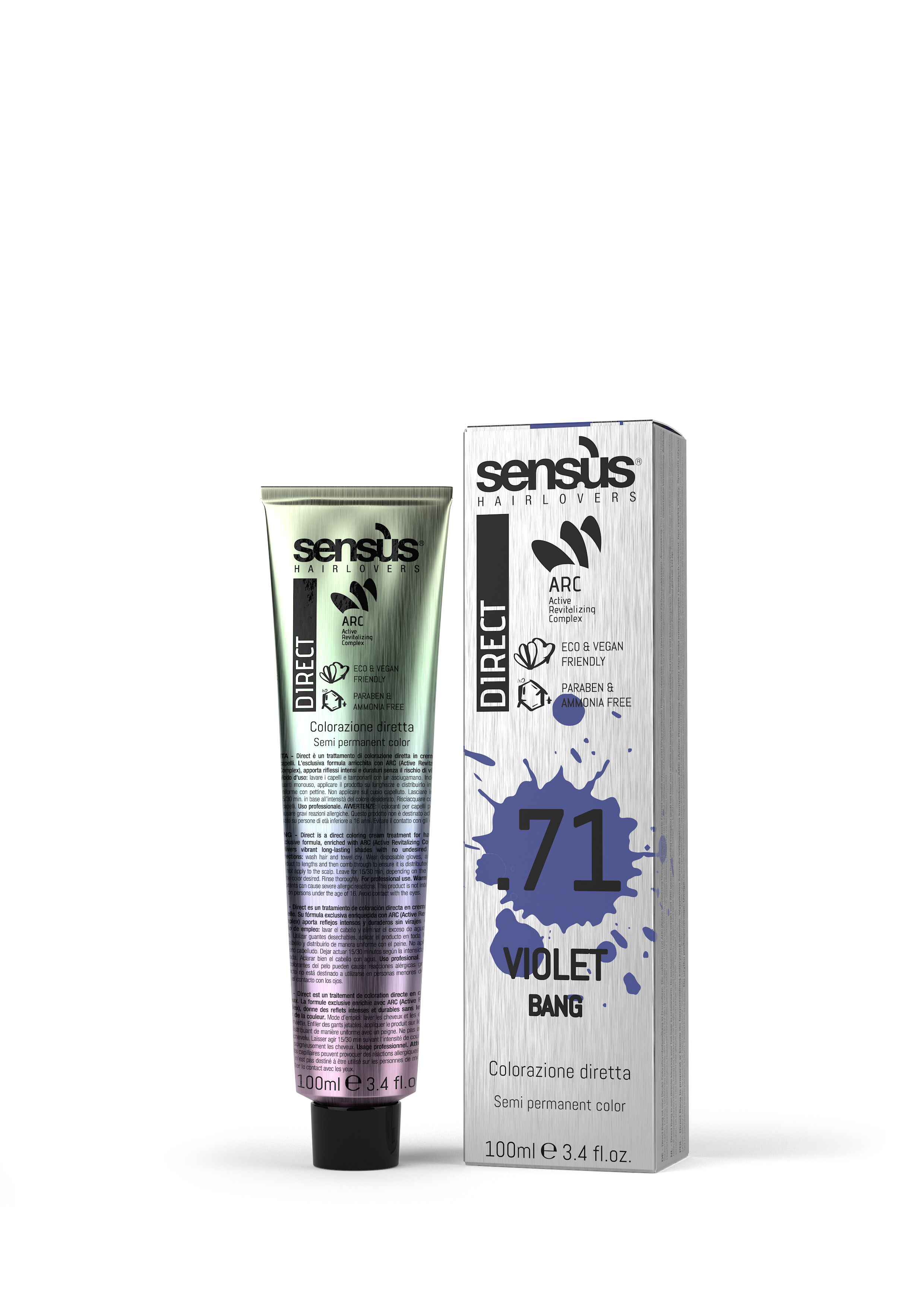 Sensus Direct Bang je přímý barvící pigment na vlasy. Exkluzivní receptura, obohacená o ARC (aktivní revitalizační komplex), poskytuje pestré dlouhotrvající odstíny. Aktivní revitalizační komplex (ARC) je směs biomimetických rostlinných aminokyselin napodobuje činnost keratinové struktury vlasů. Posiluje a omlazuje vlasy. Má regenerační, multifunkční účinek optimalizovaný pro interakci na molekulární úrovni ve vlasech. Obnovuje vlasové vlákno.