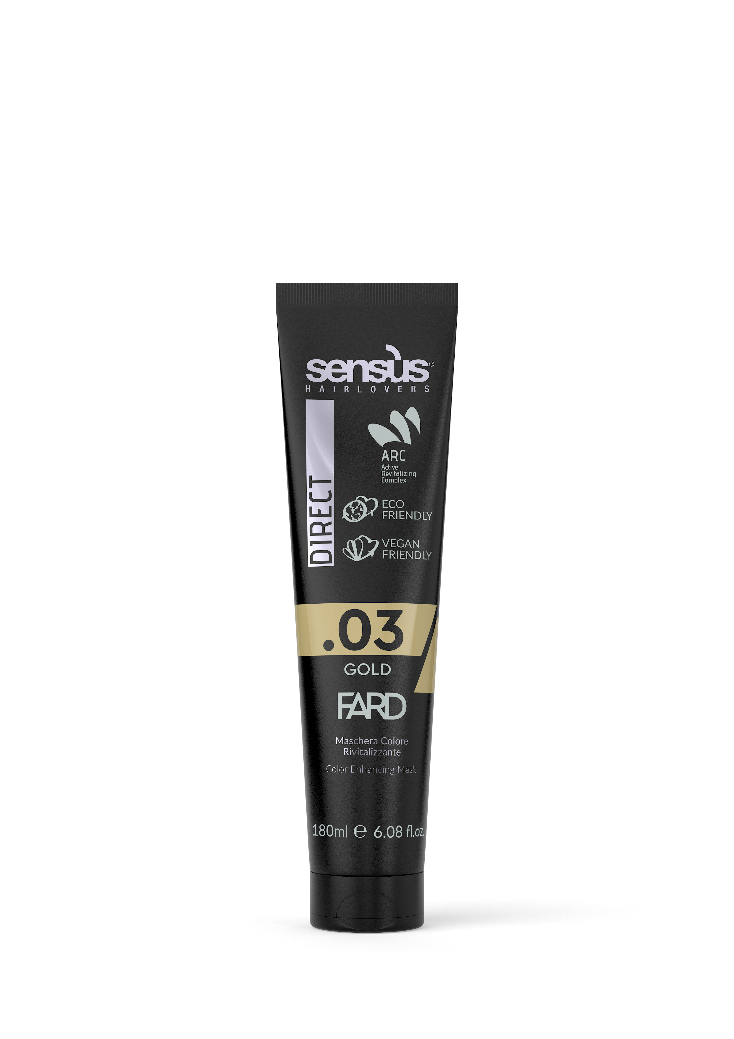 Sensus Direct Fard .03 Gold je barevná rozjasňující maska na vlasy obohacena o ARC (aktivní revitalizační komplex), rostlinný keratin, kolagen a elastan. Hloubkově vlasy vyživuje, regeneruje a dodává jim lesk. Tato maska zaručí perfektní oživení barvy a regeneraci barvených i přírodních vlasů.