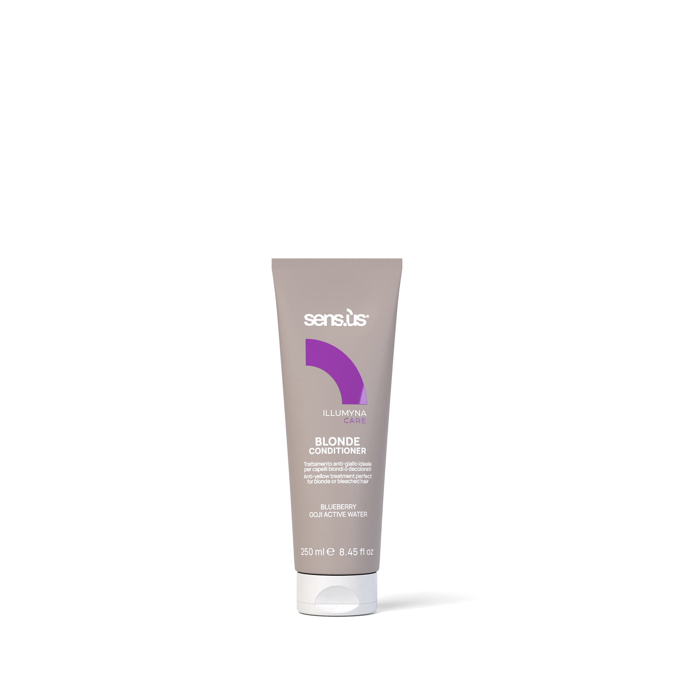 Sensus Illumyna Care Blonde Conditioner je kondicionér proti žloutnutí s obsahem aktivní vody goji, borůvek, hedvábných a sójových proteinů. Vhodný pro odbarvené, melírované blond nebo šedé vlasy. Jeho složení neutralizuje nežádoucí nažloutlé odlesky a dodává vlasům lesk a hebkost. Borůvky jsou známé svým vysokým obsahem vitaminů A, B a C a antioxidantů, které jsou klíčem k udržení zářivých a živých blond vlasů. Obsahují antokyaninové pigmenty, které mají „protižluté“ vlastnosti. Aktivní voda z goji je vzácná složka péče o vlasy, která je hloubkově vyživuje a hydratuje. Tato antioxidační voda získaná z nálevu z bobulí goji je plná vitamínů, zanechává vlasy hedvábné a zářivé a zároveň je chrání před vnějšími agresory. Hedvábné proteiny se získávají přímo z čištění hedvábných kokonů a jsou klíčovou složkou při posilování vlasového stvolu a omezování třepení a lámání vlasů. Hloubkově hydratují vlasy, zanechávají je hebké a poddajné a vytvářejí hladký povrch, který zvyšuje lesk. Sójové proteiny jsou klíčové pro posílení a hydrataci odbarvených vlasů. Vytvářejí ochranný film, který vyhlazuje kutikuly, zvyšuje lesk a zanechává vlasy poddajnější. Jejich antioxidační vlastnosti také pomáhají předcházet stárnutí vlasů.