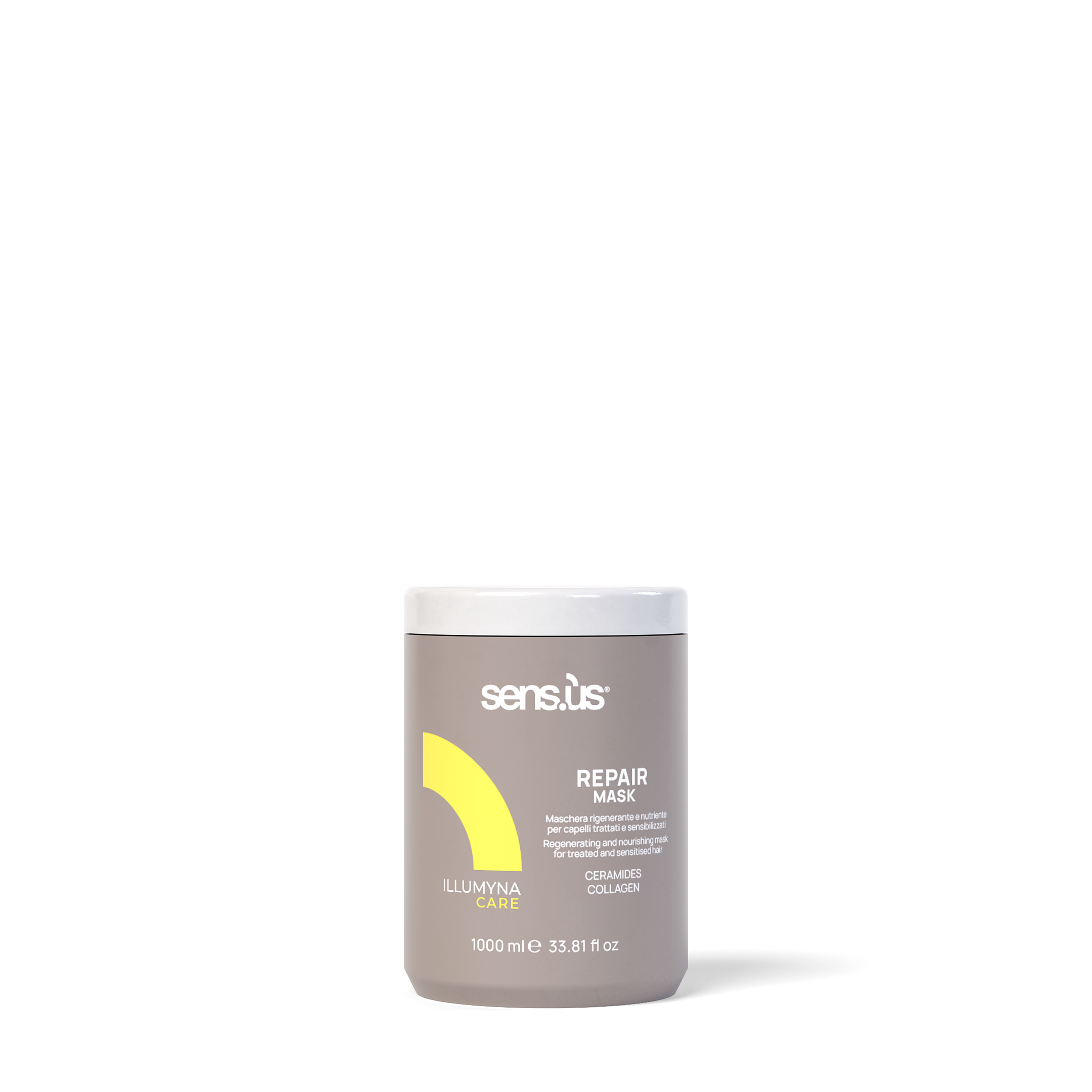 Sensus Illumyna Care Repair Mask je regenerační a vyživující maska pro ošetřené a citlivé vlasy. S ceramidy, kolagenem a kašmírovými proteiny. Ideální pro lámavé, dehydratované a často ošetřované vlasy. Vlasy jsou po aplikaci lesklé a hedvábné na dotek. Ceramidy jsou esenciální lipidy přirozeně se vyskytující ve vlasech. Tyto lipidové molekuly udržují celkové zdraví a integritu vlasů, udržují vlhkost a snižují suchost. Pomáhají napravovat škody způsobené teplem a vnějšími vlivy a zároveň zvyšují elasticitu. Kolagen je přirozeně se vyskytující protein, který pomáhá posilovat a zlepšovat strukturu vlasů. Hluboce hydratuje, pomáhá udržet křehké vlasy jemné, pružné a lesklé a zároveň bojuje proti krepatění a podporuje regeneraci vlasového vlákna. Kašmírové proteiny jsou molekuly s lehkou strukturou, které pokrývají vlasy ochranným filmem a zanechávají je lesklé a hedvábné, aniž by je zatěžovaly. Posilují vlasy poškozené tepelným a chemickým ošetřením, zvyšují hebkost.