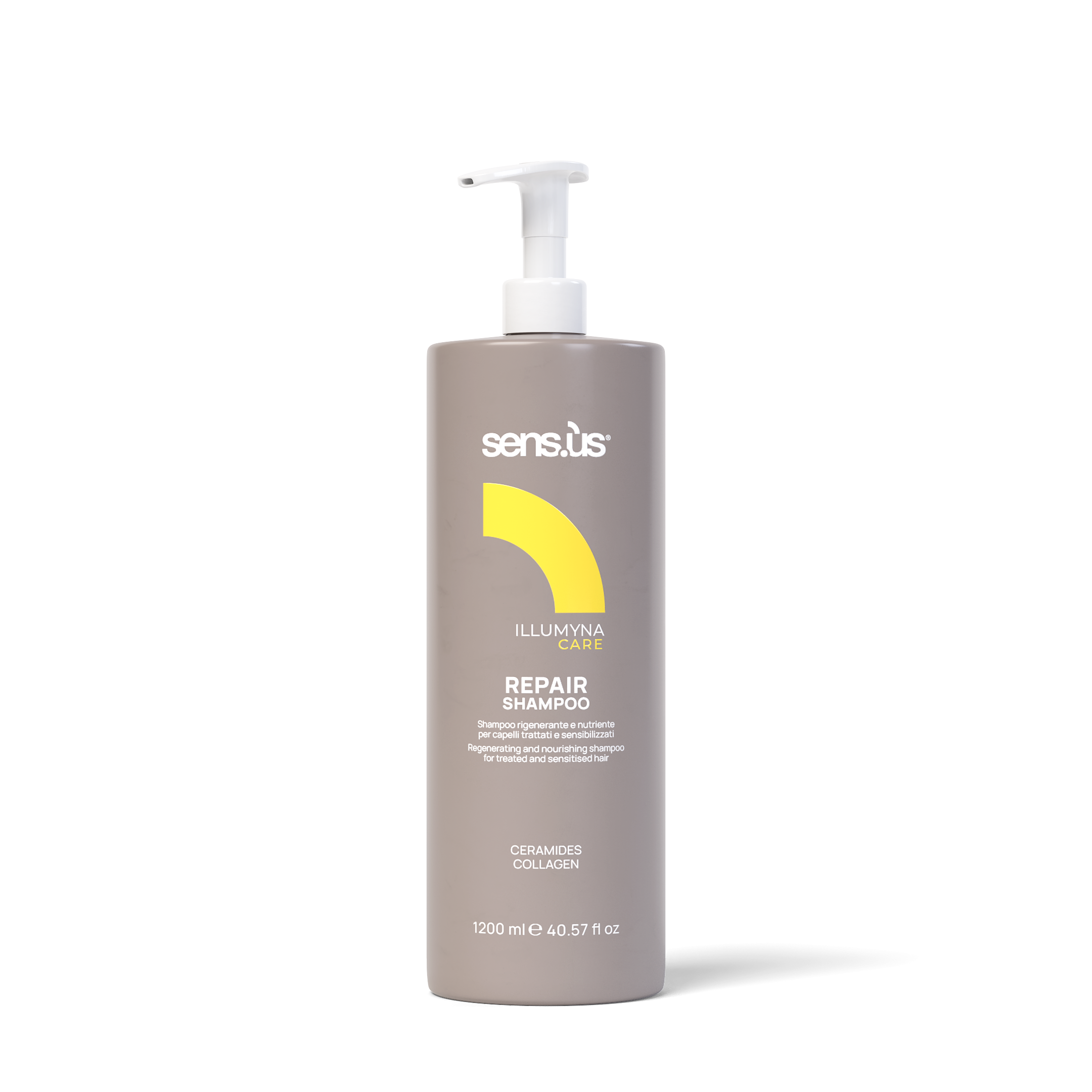 Sensus Illumyna Care Repair Shampoo je regenerační a vyživující šampon pro citlivé a chemicky ošetřené vlasy. Ideální pro křehké, dehydrované vlasy, které podstupují časté ošetřování. Jemně čistí vlasy a zanechává je jemné a hedvábné. Obsahuje ceramidy, kolagen a kašmírové proteiny. Ceramidy jsou esenciální lipidy přirozeně se vyskytující ve vlasech. Tyto lipidové molekuly udržují celkové zdraví a integritu vlasů, udržují vlhkost a snižují suchost. Pomáhají napravovat škody způsobené teplem a vnějšími vlivy a zároveň zvyšují elasticitu. Kolagen je přirozeně se vyskytující protein, který pomáhá posilovat a zlepšovat strukturu vlasů. Hluboce hydratuje, pomáhá udržet křehké vlasy jemné, pružné a lesklé a zároveň bojuje proti krepatění a podporuje regeneraci vlasového vlákna. Kašmírové proteiny jsou molekuly s lehkou strukturou, které pokrývají vlasy ochranným filmem a zanechávají je lesklé a hedvábné, aniž by je zatěžovaly. Posilují vlasy poškozené tepelným a chemickým ošetřením, zvyšují hebkost.