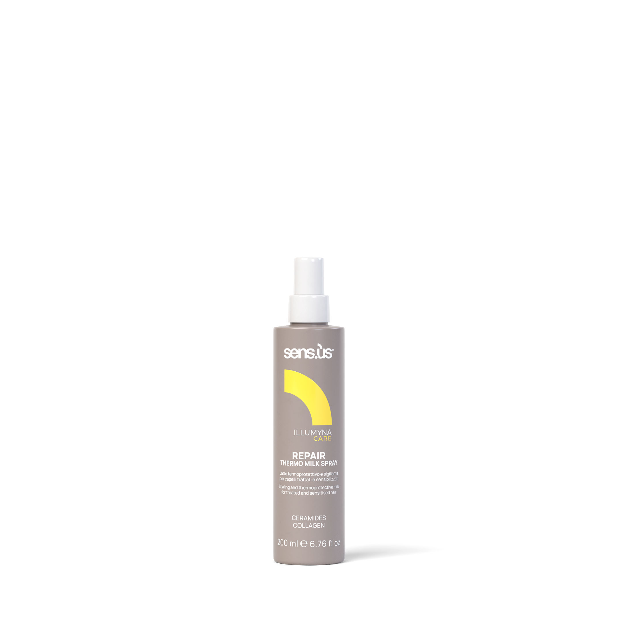 Sensus Illumyna Care Repair Thermo Milk Spray je regenerační a pečující mléko s vyživujícím účinkem pro ošetřené a citlivé vlasy. S ceramidy, kolagenem a kašmírovými proteiny. Dodává vlasům hebkost, hedvábnost a ochranu před vlhkostí. Ceramidy jsou esenciální lipidy přirozeně se vyskytující ve vlasech. Tyto lipidové molekuly udržují celkové zdraví a integritu vlasů, udržují vlhkost a snižují suchost. Pomáhají napravovat škody způsobené teplem a vnějšími vlivy a zároveň zvyšují elasticitu. Kolagen je přirozeně se vyskytující protein, který pomáhá posilovat a zlepšovat strukturu vlasů. Hluboce hydratuje, pomáhá udržet křehké vlasy jemné, pružné a lesklé a zároveň bojuje proti krepatění a podporuje regeneraci vlasového vlákna. Kašmírové proteiny jsou molekuly s lehkou strukturou, které pokrývají vlasy ochranným filmem a zanechávají je lesklé a hedvábné, aniž by je zatěžovaly. Posilují vlasy poškozené tepelným a chemickým ošetřením, zvyšují hebkost.