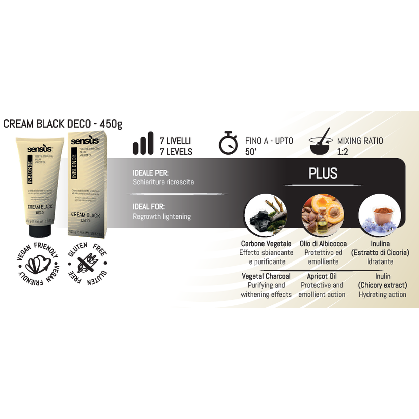 Sensus Inblonde Cream Black Deco je černý zesvětlovač krémového složení. Zesvětlení až o 7 tónů. Ideální pro velmi precizní techniky s potlačením nežádoucích tónů. S obsahem aktivního uhlí, meruňkového oleje a inulinu. Aktivní uhlí se získává z různých druhů dřeva například z břízy nebo vrby. Má výraznou absorpční a regenerační vlastnost. Meruňkový olej je známý především svými uklidňujícími, protizánětlivými, antiseptickými, hydratačními a zvláčňujícími vlastnostmi. Obsahuje vitamíny A a E. Vlasy jsou méně krepaté, silnější, zdravější a bez roztřepených konečků. Inulin má kondicionační, hydratační a uklidňující vlastnosti. Díky němu jsou vlasy hladší a snadněji se rozčesávají.